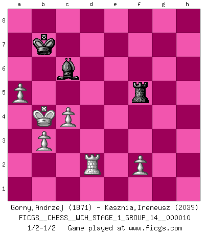Last move : 1/2-1/2 2012 September 29 16:22:56 [Event "FICGS__CHESS__WCH_STAGE_1_GROUP_14__000010"] [Site "FICGS"] [Date "2012.01.01"] [Round "1"] [White "Gorny,Andrzej"] [Black "Kasznia,Ireneusz"] [Result "1/2-1/2"] [WhiteElo "1871"] [BlackElo "2039"] 1.e4 e6 2.d4 d5 3.Nd2 dxe4 4.Nxe4 Nf6 5.Nxf6+ Qxf6 6.Nf3 h6 7.Bd3 Bd6 8.Be3 Bd7 9.Nd2 Nc6 10.Ne4 Qh4 11.g3 Qh3 12.Qd2 Ne7 13.O-O-O Nd5 14.Nxd6+ cxd6 15.Bf4 Nxf4 16.Qxf4 Bc6 17.Rhe1 O-O 18.Qxd6 Qxh2 19.Qf4 Qg2 20.Re3 b5 21.g4 b4 22.Rg3 Qd5 23.g5 h5 24.g6 fxg6 25.Qe3 Rf6 26.Rdg1 Rd8 27.Rxg6 Rxg6 28.Rxg6 Be8 29.Rxe6 Bf7 30.Re7 Qxd4 31.Qxd4 Rxd4 32.Rxa7 g6 33.Kd2 h4 34.Ke3 Rg4 35.Bf1 Rg1 36.Bh3 Rh1 37.Bd7 g5 38.Ra5 h3 39.Rxg5+ Kf8 40.Bc6 Rb1 41.b3 h2 42.Rb5 Re1+ 43.Kf4 Be8 44.Rb8 Kf7 45.Bd5+ Ke7 46.Rxb4 Kd6 47.Bf3 h1Q 48.Rd4+ Kc5 49.Rc4+ Kb6 50.Bxh1 Rxh1 51.Rb4+ Kc7 52.Kg5 Kd6 53.a4 Rh5+ 54.Kf6 Rh6+ 55.Kg5 Rh5+ 56.Kg4 Rc5 57.Rd4+ Kc7 58.c4 Ra5 59.Rd5 Bd7+ 60.Kf4 Ra8 61.Ke5 Bc6 62.Rd3 Ra5+ 63.Kd4 Rf5 64.Kc3 Kb7 65.Rd2 Kb6 66.Kb4 Kb7 67.a5 Be8 68.Rd8 Bc6 69.Rd2 Be8 70.Rd8 Bc6 71.Rd2 1/2-1/2 French : Tarrasch Queenside Castling by player White (move 13) Kingside Castling by player Black (move 17) Promotion Queen by player Black (move 47) 10 pieces endgame at move 50 : White KRBPPPP , Black KRB WHITE : King + 1 Rook 1 Bishop 4 Pawns BLACK : King + 1 Rook 1 Bishop 9 pieces endgame at move 50 : White KRPPPP , Black KRB WHITE : King + 1 Rook 4 Pawns BLACK : King + 1 Rook 1 Bishop This chess game ended in a draw. Follow this game move after move (download)A chess genius has died; a loss for humanity. (Viktor Kortchnoi, about Bobby Fischer's death) Wenn Spassky eine Figur opfert kannst du genauso gut aufgeben. Aber wenn Tal eine Figur opfert, spiel weiter. Er könnte noch eine weitere opfern, und dann ... wer weiß? (Miguel Najdorf) Aquel que toma al Peón de Caballo de la Reina, se pasará la noche a dormir en la calle. (Anónimo) Les échecs sont utiles à l'exercice de la faculté de penser et à celle de l'imagination. Car nous devons posséder une méthode élaborée pour atteindre des buts partout où nous devons conduire notre raison. (Leibnitz) The ego is not master in its own house. (Sigmund Freud)