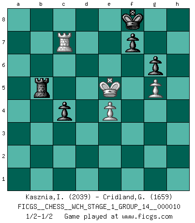 Last move : 1/2-1/2 2012 June 6 20:8:8 [Event "FICGS__CHESS__WCH_STAGE_1_GROUP_14__000010"] [Site "FICGS"] [Date "2012.01.01"] [Round "1"] [White "Kasznia,Ireneusz"] [Black "Cridland,Graham"] [Result "1/2-1/2"] [WhiteElo "2039"] [BlackElo "1659"] 1.d4 Nf6 2.c4 g6 3.Nc3 Bg7 4.e4 d6 5.Nf3 O-O 6.Be2 e5 7.dxe5 dxe5 8.Qxd8 Rxd8 9.Bg5 Re8 10.Bxf6 Bxf6 11.Rd1 c6 12.h4 Nd7 13.h5 Nc5 14.Kf1 Be6 15.b4 Nd7 16.g3 a5 17.b5 Rad8 18.Kg2 Nc5 19.Rb1 Bg4 20.hxg6 hxg6 21.bxc6 bxc6 22.Rb6 Re6 23.Rd1 Red6 24.Rxd6 Rxd6 25.Rb8+ Kg7 26.Ra8 Bxf3+ 27.Bxf3 Bd8 28.Nb1 Bb6 29.Rb8 Ba7 30.Ra8 Rd7 31.Nc3 Nd3 32.Be2 Bxf2 33.Bxd3 Rxd3 34.Kxf2 Rxc3 35.Rxa5 Rxc4 36.Rxe5 Rc2+ 37.Kf3 Rxa2 38.Rc5 Ra6 39.Kf4 Kf6 40.Re5 Rb6 41.g4 Rb5 42.g5+ Kg7 43.Re7 c5 44.Rc7 Kf8 45.Ke5 c4 46.Kf6 Rb6+ 47.Ke5 Rb5+ 1/2-1/2 King's Indian : Andersson variation Kingside Castling by player Black (move 5) 10 pieces endgame at move 36 : White KRPPP , Black KRPPP WHITE : King + 1 Rook 3 Pawns BLACK : King + 1 Rook 3 Pawns 9 pieces endgame at move 37 : White KRPP , Black KRPPP WHITE : King + 1 Rook 2 Pawns BLACK : King + 1 Rook 3 Pawns This chess game ended in a draw. Follow this game move after move (download)Fischer prefers to enter Chess history alone. (Miguel Najdorf) Sicherlich können nur Meister einen Stil haben. Daß ein nicht-Meister auch nur ein einziges Mal in seinem Leben eine Partie folgerecht durchführte, habe ich niemals bemerkt. (Emanuel Lasker) Un entendimiento a fondo de las continuaciones típicas del mate, hace de las combinaciones de sacrificio mas complicadas conducirlas a ellas no solo sin dificultad, sino casi de una manera natural. (Siegbert Tarrasch) Une platitude souvent récitée à propos des Echecs est qu'une des choses les plus difficiles à réaliser est de gagner une position gagnante. Cela ne manque pas de sens mais, pour ma part, j'ai toujours trouvé plus difficile de gagner une position perdante. (Tim Krabbe) Everything in life is luck. (Donald Trump)