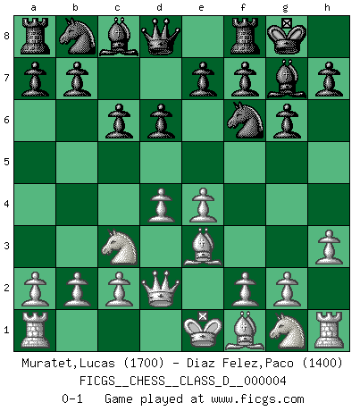 Last move : 0-1 2006 June 26 11:57:27 [Event "FICGS__CHESS__CLASS_D__000004"] [Site "FICGS"] [Date "2006.05.11"] [Round "1"] [White "Muratet,Lucas"] [Black "Diaz Felez,Paco"] [Result "0-1"] [WhiteElo "1700"] [BlackElo "1400"] 1.e4 d6 2.d4 Nf6 3.Nc3 g6 4.h3 Bg7 5.Be3 O-O 6.Qd2 c6 0-1 This chess game has been lost on time (started : 2006.05.11 8:43:21) Pirc defense Kingside Castling by player Black (move 5) Player Black won this chess game. Follow this game move after move (download)There is only one thing Fischer does in Chess without pleasure: to lose ! (Boris Spassky) Jeder weiß, dass Gasprom Putins persönliches Machtinstrument ist. Die Firma wird vom Kreml aus geleitet und wird schon deshalb nie transparent sein. (Garry Kasparov) Mi estilo es algo parecido entre un poco de Tal y Petrosian. (Reshevsky) Celui qui prend des risques peut perdre, celui qui n'en prend pas perd toujours. (Xavier Tartacover) Somewhere in the world there is an epigram for every dilemma. (Hendrik Willem van Loon)