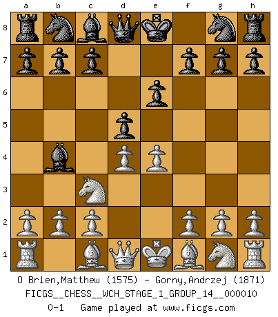 Last move : 0-1 2012 February 7 1:1:22 [Event "FICGS__CHESS__WCH_STAGE_1_GROUP_14__000010"] [Site "FICGS"] [Date "2012.01.01"] [Round "1"] [White "O Brien,Matthew"] [Black "Gorny,Andrzej"] [Result "0-1"] [WhiteElo "1575"] [BlackElo "1871"] 1.e4 e6 2.d4 d5 3.Nc3 Bb4 0-1 French : Winawer (Nimzovich) variation Player Black won this chess game. Follow this game move after move (download)Don't even mention losing to me. I can't stand to think of it. (Bobby Fischer) Ich verachte Kasparow. (Viktor Kortschnoi) Con o sin el título, Bobby Fischer fue sin lugar a dudas el mas grande jugador de su época. (Burt Hochberg) Ce qui caractérise les parties de combat, c'est que si le défenseur a constamment de difficiles problèmes à résoudre, l'attaquant doit chercher sans relâche de nouvelles possibilités d'attaque. (Koblentz) I've lost money so fast in these clubs it's left me reeling. I've read every poker book ever written, but the only way to get better at the game is to go out and play with people who are really good. The problem is, you stand to lose a lot of money doing it. (Matt Damon)
