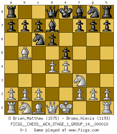 Last move : 0-1 2012 February 6 19:7:23 [Event "FICGS__CHESS__WCH_STAGE_1_GROUP_14__000010"] [Site "FICGS"] [Date "2012.01.01"] [Round "1"] [White "O Brien,Matthew"] [Black "Bromo,Alexis"] [Result "0-1"] [WhiteElo "1575"] [BlackElo "1193"] 1.e4 e5 2.Nf3 Nc6 3.Bb5 d6 4.d4 Bd7 0-1 This chess game has been lost on time (started : 2012.01.01 23:30:7) Ruy Lopez : Old Steinitz defense Player Black won this chess game. Follow this game move after move (download)Chess is in its essence a game, in its form an art, and in its execution a science. (Baron Tassilo) Gewinnen beim Schach fördert das Selbstvertrauen. Beim Sex spüre ich sowas nicht... (Garry Kasparov) Un jugador que trata de regresar una movida en el Ajedrez es un futuro carterista. (Richard Fenton) La vérité est comme le meilleur coup aux échecs : elle existe, mais il faut la chercher. (Arturo Perez-Reverte) Creativity is allowing yourself to make mistakes. Art is knowing which ones to keep. (Scott Adams)