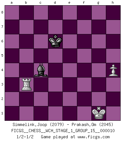 Last move : 1/2-1/2 2012 February 1 16:42:26 [Event "FICGS__CHESS__WCH_STAGE_1_GROUP_15__000010"] [Site "FICGS"] [Date "2012.01.01"] [Round "1"] [White "Simmelink,Joop"] [Black "Prakash,Om"] [Result "1/2-1/2"] [WhiteElo "2079"] [BlackElo "2045"] 1.e4 c5 2.Nf3 d6 3.d4 cxd4 4.Nxd4 Nf6 5.Nc3 a6 6.Bg5 e6 7.f4 Qb6 8.Qd2 Qxb2 9.Rb1 Qa3 10.e5 h6 11.Bh4 dxe5 12.fxe5 g5 13.exf6 gxh4 14.Be2 Qa5 15.O-O Nd7 16.Kh1 Qg5 17.Rf4 e5 18.Nd5 exd4 19.Qxd4 Bc5 20.Qe4+ Kd8 21.Rf5 Re8 22.Qxe8+ Kxe8 23.Rxg5 hxg5 24.Nc7+ Kd8 25.Nxa8 Nxf6 26.Bf3 b5 27.Rd1+ Ke7 28.h3 Bd7 29.Re1+ Kd6 30.Rf1 a5 31.Rd1+ Ke7 32.Nc7 Bd6 33.Re1+ Kf8 34.Nd5 Nxd5 35.Bxd5 f6 36.Bc6 Bxc6 37.Re6 Bd5 38.Rxd6 Bxa2 39.Rxf6+ Ke7 40.Rf5 Bc4 41.g3 hxg3 42.Rxg5 a4 43.Rxg3 Kd6 44.h4 b4 45.Kg1 b3 46.cxb3 axb3 47.Rxb3 1/2-1/2 Sicilian : Najdorf, 7...Qb6 Kingside Castling by player White (move 15) 10 pieces endgame at move 41 : White KRPP , Black KBPPPP WHITE : King + 1 Rook 2 Pawns BLACK : King + 1 Bishop 4 Pawns 9 pieces endgame at move 42 : White KRPP , Black KBPPP WHITE : King + 1 Rook 2 Pawns BLACK : King + 1 Bishop 3 Pawns 8 pieces endgame at move 43 : White KRPP , Black KBPP WHITE : King + 1 Rook 2 Pawns BLACK : King + 1 Bishop 2 Pawns 7 pieces endgame at move 46 : White KRPP , Black KBP WHITE : King + 1 Rook 2 Pawns BLACK : King + 1 Bishop 1 Pawn 6 pieces endgame at move 46 : White KRP , Black KBP WHITE : King + 1 Rook 1 Pawn BLACK : King + 1 Bishop 1 Pawn 5 pieces endgame at move 47 : White KRP , Black KB WHITE : King + 1 Rook 1 Pawn BLACK : King + 1 Bishop This chess game ended in a draw. Follow this game move after move (download)Chess is like life. (Boris Spassky) Wie, soll nun auch die Opposition abgeschafft werden? Ja, es tut mir leid, Ihnen diesen Schmerz nicht ersparen zu können. (Aaron Nimzowitsch) No hay precio que sea tan grande por la cabellera del Rey enemigo. (Koblentz) La menace est plus forte que l'exécution. (Aaron Nimzovitch) Without deviation from the norm, progress is not possible. (Frank Zappa)