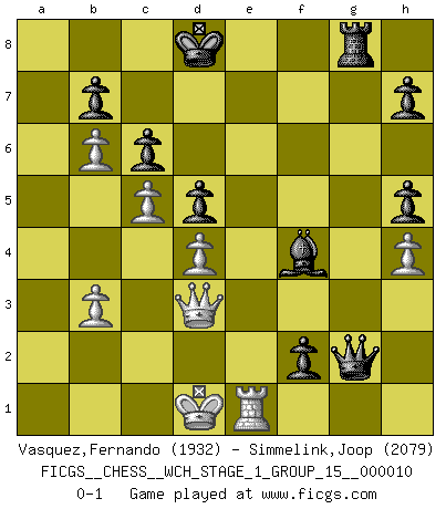 Last move : 0-1 2012 March 12 23:10:14 [Event "FICGS__CHESS__WCH_STAGE_1_GROUP_15__000010"] [Site "FICGS"] [Date "2012.01.01"] [Round "1"] [White "Vasquez,Fernando"] [Black "Simmelink,Joop"] [Result "0-1"] [WhiteElo "1932"] [BlackElo "2079"] 1.e4 Nc6 2.d4 d5 3.e5 f6 4.Nf3 Bg4 5.Bb5 Qd7 6.h3 Bxf3 7.Qxf3 fxe5 8.Bxc6 Qxc6 9.Qh5+ Kd7 10.Qxe5 e6 11.Qe2 Bd6 12.Nc3 Re8 13.O-O a6 14.Re1 Nh6 15.Bxh6 gxh6 16.Rab1 Kc8 17.Qd3 Qd7 18.b4 h5 19.b5 a5 20.b6 c6 21.Nd1 Rhg8 22.c4 Ref8 23.c5 Bb8 24.Rb3 Qg7 25.Ne3 e5 26.Qf1 e4 27.Qe2 Rf3 28.Qd2 Bf4 29.h4 Rh3 30.Qxa5 Rxe3 31.g3 Bxg3 32.Kf1 Rxb3 33.axb3 Bf4 34.Qc3 Qg1+ 35.Ke2 Qg4+ 36.Kf1 Qg2+ 37.Ke2 e3 38.Qd3 Kd8 39.Kd1 exf2 0-1 KP : Nimzovich defense Kingside Castling by player White (move 13) Player Black won this chess game. Follow this game move after move (download)Many Chess players were surprised when after the game, Fischer quietly explained: 'I had already analyzed this possibility' in a position which I thought was not possible to foresee from the opening. (Mikhail Tal) Ein Remis kann durch Wiederholung von drei Zügen oder durch einen schlechte Zug erreicht werden. (Savielly Grigorievitsch Tartakower) Bendita sea la memoria de aquel que dio al mundo este juego inmortal. (A. G. Gardiner) Le joueur d'Echecs qui veut atteindre le top est obligé de développer son propre credo créatif. Alexeï Stepanovicth Souétine. Il est facile d'écrire des livres ! Ce qui est difficile, c'est de jouer ! (Alexeï Stepanovicth Souétine) May I never be complete. May I never be content. May I never be perfect. Deliver me, Tyler, from being perfect and complete. (Chuck Palahniuk, Fight Club)