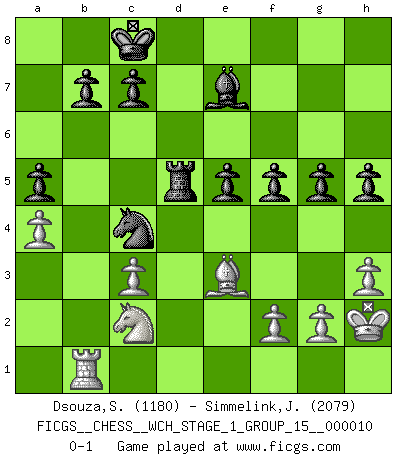 Last move : 0-1 2012 February 26 8:0:52 [Event "FICGS__CHESS__WCH_STAGE_1_GROUP_15__000010"] [Site "FICGS"] [Date "2012.01.01"] [Round "1"] [White "Dsouza,Stanislaus"] [Black "Simmelink,Joop"] [Result "0-1"] [WhiteElo "1180"] [BlackElo "2079"] 1.e4 Nc6 2.Nf3 Nf6 3.Nc3 d5 4.exd5 Nxd5 5.Nxd5 Qxd5 6.d3 e5 7.Be2 Bf5 8.O-O Be7 9.Ng5 f6 10.Nf3 O-O-O 11.Be3 g5 12.a3 h5 13.c3 Bxd3 14.Bxd3 Qxd3 15.Qxd3 Rxd3 16.Rad1 Rhd8 17.Rxd3 Rxd3 18.h3 Na5 19.Rc1 Nc4 20.Ne1 Rd5 21.Kh2 Nxb2 22.Rb1 Nc4 23.Nc2 a5 24.a4 f5 0-1 This chess game has been lost on time (started : 2012.01.01 23:31:13) KP : Nimzovich defense Kingside Castling by player White (move 8) Queenside Castling by player Black (move 10) Player Black won this chess game. Follow this game move after move (download)Tactics flow from a superior position. (Bobby Fischer) Stil? Ich habe keinen Stil! (Anatoly Karpov) Los Peones son nacidos libres, y aún así, se encuentran encadenados por todos lados. (Rick Kennedy) Si je n'étais pas joueur d'échecs, je serais le meilleur dans quelque chose d'autre. (Anatoli Karpov) The Internet is the first thing that humanity has build that humanity doesn't understand, the largest experiment in anarchy that we have ever had. (Eric Schmidt)