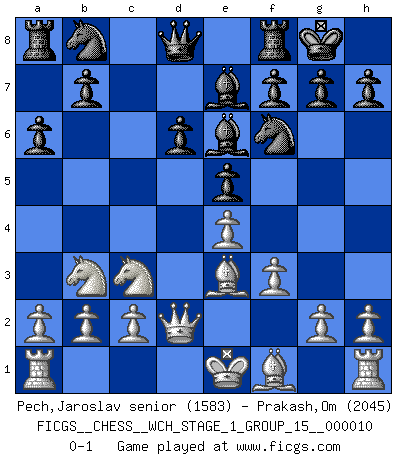 Last move : 0-1 2012 March 23 21:33:46 [Event "FICGS__CHESS__WCH_STAGE_1_GROUP_15__000010"] [Site "FICGS"] [Date "2012.01.01"] [Round "1"] [White "Pech,Jaroslav senior"] [Black "Prakash,Om"] [Result "0-1"] [WhiteElo "1583"] [BlackElo "2045"] 1.e4 c5 2.Nf3 d6 3.d4 cxd4 4.Nxd4 Nf6 5.Nc3 a6 6.Be3 e5 7.Nb3 Be6 8.f3 Be7 9.Qd2 O-O 0-1 This chess game has been lost on time (started : 2012.01.01 23:31:13) Sicilian : Najdorf, Byrne (English) attack Kingside Castling by player Black (move 9) Player Black won this chess game. Follow this game move after move (download)Every Chess master was once a beginner. (Chernev) Bis zum Jahr 1971 verlief in meiner Schachkariere alles glatt. Dieses dramatische Match [Fischer-Taimanov 6:0] machte mein Leben zur Hölle. (Mark Taimanov) El ganar no lo es todo... pero el perder es nada. (Mednis) Le thème de l'attaque double intervient d'une manière ou d'une autre dans l'immense majorité des combinaisons. (Youri Averbakh) When it is a question of money, everybody is of the same religion. (Voltaire)