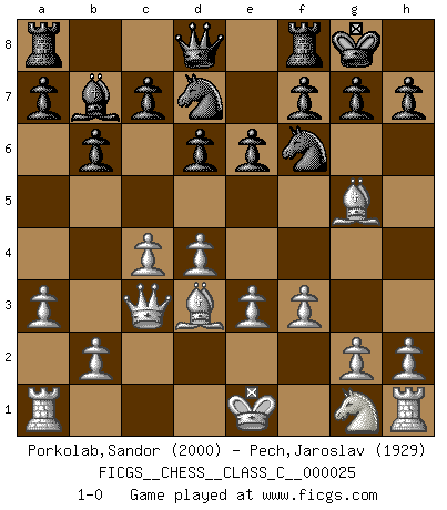 Last move : 1-0 2007 February 14 19:41:55 [Event "FICGS__CHESS__CLASS_C__000025"] [Site "FICGS"] [Date "2007.01.12"] [Round "1"] [White "Porkolab,Sandor"] [Black "Pech,Jaroslav"] [Result "1-0"] [WhiteElo "2000"] [BlackElo "1929"] 1.d4 Nf6 2.c4 e6 3.Nc3 Bb4 4.Qc2 O-O 5.a3 Bxc3+ 6.Qxc3 b6 7.Bg5 Bb7 8.e3 d6 9.f3 Nbd7 10.Bd3 1-0 Nimzo-Indian : Classical variation Kingside Castling by player Black (move 4) Player White won this chess game. Follow this game move after move (download)Chess is a forcing house where the fruits of character can ripen more fully than in life. (Edward Morgan Foster) Wenn Du absolut nicht mehr weißt, was Du tun sollst, dann ist es Zeit für Panik. (John van der Wiel) Debemos de asegurarnos de que el Ajedrez no se convierta en un lenguaje muerto, muy interesante, pero tan solo para un grupo muy pequeño. (Sytze Faber) Avant la finale, les dieux ont créé le milieu de partie. (Tarrasch) Knowledge rests not upon truth alone, but upon error also. (Carl G. Jung)