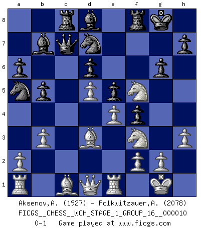 Last move : 0-1 2012 March 9 20:31:58 [Event "FICGS__CHESS__WCH_STAGE_1_GROUP_16__000010"] [Site "FICGS"] [Date "2012.01.01"] [Round "1"] [White "Aksenov,Aleksandr"] [Black "Polkwitzauer,Ardiantez"] [Result "0-1"] [WhiteElo "1927"] [BlackElo "2078"] 1.e4 e5 2.Nf3 Nc6 3.Bb5 a6 4.Ba4 Nf6 5.O-O Be7 6.Re1 b5 7.Bb3 d6 8.c3 O-O 9.h3 Na5 10.Bc2 c5 11.d4 Qc7 12.Nbd2 cxd4 13.cxd4 Bb7 14.d5 Rac8 15.Bd3 Nd7 16.Nf1 f5 17.Ng3 f4 18.Nf5 Bd8 19.b3 g6 0-1 This chess game has been lost on time (started : 2012.01.01 23:32:15) Ruy Lopez : Closed Kingside Castling by player White (move 5) Kingside Castling by player Black (move 8) Player Black won this chess game. Follow this game move after move (download)Of all my Russian books, the defense contains and diffuses the greatest 'warmth' which may seem odd seeing how supremely abstract Chess is supposed to be. (Vladimir Nabokov) Die Fehler sind da, Sie warten nur darauf gemacht zu werden. (Savielly Grigorievitsch Tartakower) Cuando estes solo, cuando te sientas un extraño en el mundo, juega al Ajedrez. Esto levantará tu espiritu y será tu consejero de guerra. (Aristóteles) Les Echecs mettent en conflit, non pas deux intelligences, mais deux volontés. (Lasker) The existence of forgetting has never been proved: We only know that some things don't come to mind when we want them. (Friedrich Nietzsche)