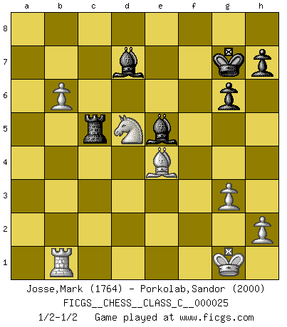 Last move : 1/2-1/2 2007 October 15 22:40:26 [Event "FICGS__CHESS__CLASS_C__000025"] [Site "FICGS"] [Date "2007.01.12"] [Round "1"] [White "Josse,Mark"] [Black "Porkolab,Sandor"] [Result "1/2-1/2"] [WhiteElo "1764"] [BlackElo "2000"] 1.e4 c5 2.Nf3 Nc6 3.d4 cxd4 4.Nxd4 Nf6 5.Nc3 e5 6.Ndb5 d6 7.Bg5 a6 8.Na3 b5 9.Nd5 Be7 10.Bxf6 Bxf6 11.c3 Bg5 12.Nc2 O-O 13.a4 bxa4 14.Rxa4 a5 15.Bc4 Rb8 16.b3 g6 17.O-O Ne7 18.Nce3 Nxd5 19.Nxd5 Bd7 20.Ra2 Kh8 21.f4 exf4 22.Qd4+ Kg8 23.Nxf4 Bf6 24.Qxd6 Bxc3 25.Nd5 Bd4+ 26.Kh1 Be6 27.Qxd8 Rbxd8 28.Rxa5 Kg7 29.g3 Bh3 30.Rd1 Be5 31.b4 Rc8 32.Ne3 Bc3 33.Ra4 Rfd8 34.Rxd8 Rxd8 35.Nd5 Be5 36.b5 f5 37.Bd3 fxe4 38.Bxe4 Rc8 39.Kg1 Bd7 40.Rb4 Bd6 41.Rb2 Be5 42.Rb1 Rc5 43.b6 1/2-1/2 Sicilian : Pelikan (Lasker/Sveshnikov) variation Kingside Castling by player Black (move 12) Kingside Castling by player White (move 17) This chess game ended in a draw. Follow this game move after move (download)Mistrust is the most necessary characteristic of the Chess player. (Siegbert Tarrasch) Im Spitzenschach von heute geht es nur um Vorbereitung, um tiefgründige, sorgfältige Eröffnungsvorbereitung. (Nigel Short) El Ajedrez, como cualquier actividad creativa, solo puede existir a través del esfuerzo combinado de aquellos que tienen talento creativo y de aquellos que poseen la habilidad de organizar su trabajo creativo. (Mikhail Botvinnik) Seul un grand joueur sait à quel point il joue faiblement. (Xavier Tartacover) Man is reluctant to give credit for intelligence to anyone, except his enemies. (Albert Einstein)