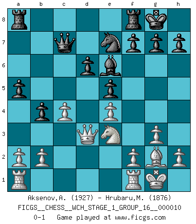 Last move : 0-1 2012 February 29 7:58:46 [Event "FICGS__CHESS__WCH_STAGE_1_GROUP_16__000010"] [Site "FICGS"] [Date "2012.01.01"] [Round "1"] [White "Aksenov,Aleksandr"] [Black "Hrubaru,Mircea"] [Result "0-1"] [WhiteElo "1927"] [BlackElo "1876"] 1.e4 c5 2.Nf3 Nc6 3.d4 cxd4 4.Nxd4 Nf6 5.Nc3 e5 6.Ndb5 d6 7.Bg5 a6 8.Na3 b5 9.Nd5 Be7 10.Bxf6 Bxf6 11.c4 b4 12.Nc2 a5 13.g3 Bg5 14.Bg2 O-O 15.O-O Ne7 16.Nce3 Bxe3 17.Nxe3 Be6 18.Qd3 Qc7 0-1 This chess game has been lost on time (started : 2012.01.01 23:32:15) Sicilian : Pelikan (Lasker/Sveshnikov) variation Kingside Castling by player Black (move 14) Kingside Castling by player White (move 15) Player Black won this chess game. Follow this game move after move (download)I believe that Chess possesses a magic that is also a help in advanced age. A rheumatic knee is forgotten during a game of Chess and other events can seem quite unimportant in comparison with a catastrophe on the chessboard. (Vlastimil Hort) Je mehr wir mit Computern analysieren, desto mehr glauben wir an Verteidigung. (Vladimir Kramnik) Bobby Fischer es el mas grande genio de Ajedrez de todos los tiempos. (Alexander Kotov) C'est la seule position que je connaisse où les deux camps sont mals. Propos prêtés à V. Anand. To steal ideas from one person is plagiarism. To steal from many is research. (Unknown)