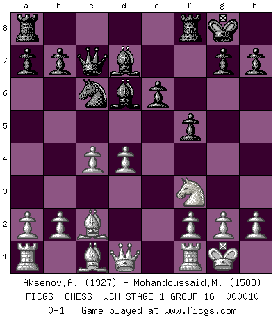 Last move : 0-1 2012 March 15 8:41:36 [Event "FICGS__CHESS__WCH_STAGE_1_GROUP_16__000010"] [Site "FICGS"] [Date "2012.01.01"] [Round "1"] [White "Aksenov,Aleksandr"] [Black "Mohandoussaid,Malik"] [Result "0-1"] [WhiteElo "1927"] [BlackElo "1583"] 1.e4 d5 2.exd5 Nf6 3.Nf3 Bg4 4.Bb5+ Bd7 5.Bc4 c6 6.Nc3 cxd5 7.Nxd5 Nxd5 8.Bxd5 Nc6 9.Be4 e6 10.d4 Bd6 11.O-O Qc7 12.c4 f5 13.Bc2 O-O 0-1 This chess game has been lost on time (started : 2012.01.01 23:32:15) Scandinavian defense Kingside Castling by player White (move 11) Kingside Castling by player Black (move 13) Player Black won this chess game. Follow this game move after move (download)Half the variations which are calculated in a tournament game turn out to be completely superfluous. Unfortunately, no one knows in advance which half. (Jan Tinman) Über Karpov: Er war und ist ein Vertreter der russischen Reaktionäre. Das steckt tief in seiner Seele, wehalb ich nicht nett mit ihm umgehen kann. (Viktor Kortschnoi) Siempre es mejor sacrificar los hombres de tu oponente. (Savielly Tartakower) Pour moi, les échecs ne sont pas un jeu mais un art. (Alexandre Alekhine) The man who strikes first admits that his ideas have given out. (Chinese proverb)