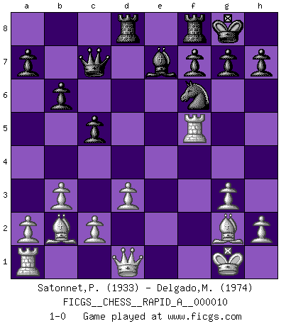 Last move : 1-0 2007 April 4 3:44:14 [Event "FICGS__CHESS__RAPID_A__000010"] [Site "FICGS"] [Date "2007.01.12"] [Round "1"] [White "Satonnet,Patrick"] [Black "Delgado,Mauricio"] [Result "1-0"] [WhiteElo "1933"] [BlackElo "1974"] 1.e4 c5 2.f4 d5 3.Nc3 dxe4 4.Nxe4 e6 5.Nf3 Nd7 6.g3 Ngf6 7.Nxf6+ Nxf6 8.Bg2 Be7 9.b3 O-O 10.Bb2 Qc7 11.O-O b6 12.f5 exf5 13.Nh4 Rb8 14.Nxf5 Bxf5 15.Rxf5 Rbd8 16.d3 1-0 This chess game has been lost on time (started : 2007.01.12 18:14:12) Sicilian : Grand Prix attack Kingside Castling by player Black (move 9) Kingside Castling by player White (move 11) Player White won this chess game. Follow this game move after move (download)There is only one thing Fischer does in Chess without pleasure: to lose ! (Boris Spassky) Ich habe Putins Aufstieg an die Macht beobachtet und seine Politik, die demokratischen Institutionen meines Landes zu zerstören. (Garry Kasparov) De eso se trata el Ajedrez. Un día le das una lección a tu oponente y al día siguiente el te da una a tí. (Bobby Fischer) Lorsque vous vous retrouvez devant une position atroce, ne tendez pas un ultime piège dérisoire avec l'intention d'abandonner si l'adversaire le déjoue ! Faites-vous plutôt un devoir de résister comme si votre vie en dépendait. Jouez le coup qui vous déplairait au centuple si vous étiez dans la peau de votre tortionnaire ! You must have a dream in order to have it come true. (A.P.J. Kalam)