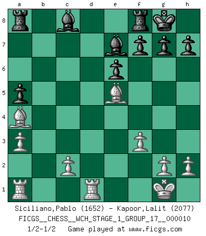 Last move : 1/2-1/2 2012 March 14 8:15:39 [Event "FICGS__CHESS__WCH_STAGE_1_GROUP_17__000010"] [Site "FICGS"] [Date "2012.01.01"] [Round "1"] [White "Siciliano,Pablo"] [Black "Kapoor,Lalit"] [Result "1/2-1/2"] [WhiteElo "1652"] [BlackElo "2077"] 1.e4 c5 2.Nf3 d6 3.d4 cxd4 4.Nxd4 Nf6 5.Nc3 a6 6.Bc4 e6 7.Bb3 b5 8.O-O Be7 9.Qf3 Qb6 10.Be3 Qb7 11.Qg3 b4 12.Na4 Nbd7 13.f3 O-O 14.a3 a5 15.Rfd1 Nc5 16.e5 Nh5 17.Qg4 dxe5 18.Qxh5 Nxa4 19.Bxa4 exd4 20.Bxd4 bxa3 21.bxa3 Qc7 22.Qe5 Qxe5 23.Bxe5 1/2-1/2 Sicilian : Najdorf, Lipnitzky attack Kingside Castling by player White (move 8) Kingside Castling by player Black (move 13) This chess game ended in a draw. Follow this game move after move (download)I prefer to lose a really good game than to win a bad one. (David Levy) Die Partien sind immer verschieden, die Interviews immer die gleichen. (Garry Kasparov) El Ajedrez no es una pizca de inferior al violín, y tenemos un gran número de violinistas profesionales. (Mikhail Botvinnik) Nous vivons dans un monde échiquéen : chaque jour qui passe est un défi à relever. (Philosophe Sasha) We're missing something. (Gregory House, House M.D.)