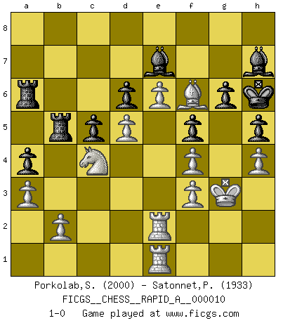 Last move : 1-0 2007 July 5 22:22:48 [Event "FICGS__CHESS__RAPID_A__000010"] [Site "FICGS"] [Date "2007.01.12"] [Round "1"] [White "Porkolab,Sandor"] [Black "Satonnet,Patrick"] [Result "1-0"] [WhiteElo "2000"] [BlackElo "1933"] 1.e4 e5 2.Nf3 Nc6 3.Bb5 Nd4 4.Nxd4 exd4 5.O-O g6 6.d3 Bg7 7.c3 Ne7 8.cxd4 Bxd4 9.Nc3 O-O 10.Bc4 Bg7 11.Bg5 h6 12.Be3 c6 13.Qf3 b5 14.Bb3 a5 15.a3 d6 16.d4 Qd7 17.Rfd1 Qg4 18.d5 c5 19.Nxb5 Ra6 20.Rd2 Qxf3 21.gxf3 a4 22.Bc4 Bd7 23.Re1 Nc8 24.Nc3 Ra7 25.f4 Re8 26.f3 Nb6 27.Ba2 Rb7 28.Bf2 R7b8 29.Kg2 f6 30.Bg3 h5 31.h4 Kh7 32.Kh2 f5 33.e5 Bh6 34.Rde2 Re7 35.Kh3 Kg8 36.Bh2 Bf8 37.Rg2 Kg7 38.Bg1 Be8 39.Rge2 Bf7 40.e6 Bg8 41.Kg3 Kh6 42.Be3 Ra7 43.Bd2 Be7 44.Nd1 Na8 45.Bc3 Nc7 46.Bc4 Nb5 47.Bxb5 Rxb5 48.Ne3 Bh7 49.Nc4 Ra6 50.Bf6 1-0 Comment by player 2 : Patrick Satonnet : congratulations :) Ruy Lopez : Bird's defense Kingside Castling by player White (move 5) Kingside Castling by player Black (move 9) Player White won this chess game. Follow this game move after move (download)It began to feel as though you were playing against Chess itself. - On playing against Robert Fischer. (Walter Shipman) Um sich vor der Gefahr einer Erkältung zu schützen, sorge der wanderlustige König beizeiten für ein brauchbares Versteck. (Aaron Nimzowitsch) ¿Cual es el objetivo de jugar una apertura de gambito?... Para adquirir una reputación de ser un jugador apuesto a costo de perder el juego. (Siegbert Tarrasch) Des idées, des idées, j'en ai cent, j'en ai mille. Des bonnes, des mauvaises, applicables, irréalisables... Il suffit de faire le tri ! (Roos) Better than a thousand days of diligent study is one day with a great teacher. (Japanese proverb)