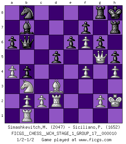 Last move : 1/2-1/2 2012 April 25 20:46:0 [Event "FICGS__CHESS__WCH_STAGE_1_GROUP_17__000010"] [Site "FICGS"] [Date "2012.01.01"] [Round "1"] [White "Simashkevitch,Mykola"] [Black "Siciliano,Pablo"] [Result "1/2-1/2"] [WhiteElo "2047"] [BlackElo "1652"] 1.e4 c5 2.Nf3 e6 3.d4 cxd4 4.Nxd4 a6 5.Bd3 Bc5 6.Nb3 Be7 7.Qg4 g6 8.Qe2 Nc6 9.O-O d6 10.Nc3 b5 11.a4 b4 12.Nd1 Nf6 13.Bh6 Bf8 14.Bxf8 Kxf8 15.Ne3 Kg7 16.f4 d5 17.Rad1 Qc7 18.e5 Nd7 19.Qe1 Bb7 20.Qh4 Qd8 21.Qg3 Rg8 22.h4 Kh8 23.Qg5 Rg7 24.Ng4 Qb6+ 25.Kh2 h5 26.Nf6 Nxf6 27.exf6 Rh7 28.Rd2 Rg8 29.Re1 Qc7 30.Rc1 Qb6 31.Rb1 Nb8 1/2-1/2 Sicilian : Kan, Polugaievsky variation Kingside Castling by player White (move 9) This chess game ended in a draw. Follow this game move after move (download)Chess is really ninety nine percent calculation. (Soltis) Vom Schach wurde gesagt das Leben sei dafür nicht lange genug. Aber das ist der Fehler des Lebens, nicht des Schach'. (Irving Chernev) Botvinnik trataba de restarle el misterio al Ajedrez, siempre relacionandolo a situaciones de la vida ordinaria. El gustaba de llamar al Ajedrez un típico problema inexacto similar a aquellos de los cuales la gente siempre tiene que enfrentarse en la vida cotidiana. (Garry Kasparov) La solitude du joueur d'Echecs à l'approche du mat est semblable à celle du condamné. (Francis Szpiner) Creativity is allowing yourself to make mistakes. Art is knowing which ones to keep. (Scott Adams)