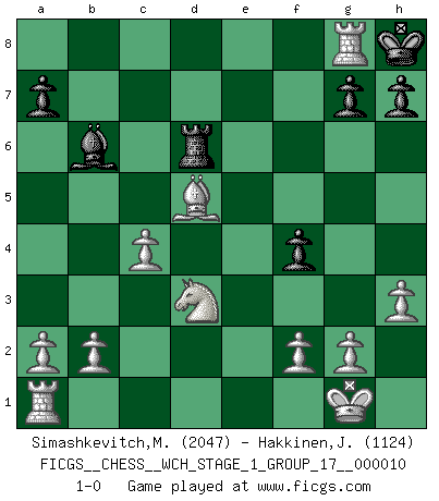 Last move : 1-0 2012 February 1 20:57:44 [Event "FICGS__CHESS__WCH_STAGE_1_GROUP_17__000010"] [Site "FICGS"] [Date "2012.01.01"] [Round "1"] [White "Simashkevitch,Mykola"] [Black "Hakkinen,Jorma"] [Result "1-0"] [WhiteElo "2047"] [BlackElo "1124"] 1.e4 e5 2.Nf3 Nc6 3.d4 exd4 4.Nxd4 Bc5 5.Nxc6 bxc6 6.Bd3 Qf6 7.O-O d6 8.Nd2 Nh6 9.Qf3 Qxf3 10.Nxf3 O-O 11.h3 d5 12.Bf4 Bd7 13.exd5 cxd5 14.Bxc7 f5 15.Ba6 Bc6 16.Ne5 Be8 17.Bb7 f4 18.Bxa8 Bb5 19.Bxd5+ Kh8 20.c4 Be8 21.Nd3 Bb6 22.Bd6 Rf6 23.Rfe1 Rxd6 24.Rxe8+ Ng8 25.Rxg8+ 1-0 Scotch game Kingside Castling by player White (move 7) Kingside Castling by player Black (move 10) Player White won this chess game. Follow this game move after move (download)Methodical thinking is of more use in Chess than inspiration. (C. J. S. Purdy) Schach ist Kampf, hauptsächlich jedoch gegen die eigenen Fehler. (Savielly Grigorievitsch Tartakower) Todos los jugadores de Ajedrez deberían tener un pasatiempo. (Savielly Tartakower) Vouloir jouer aux échecs contre soi-même est aussi paradoxal que vouloir marcher sur son ombre. (Stefan Zweig) I would love to change the world, but they won't give me the source code. (Unknown)