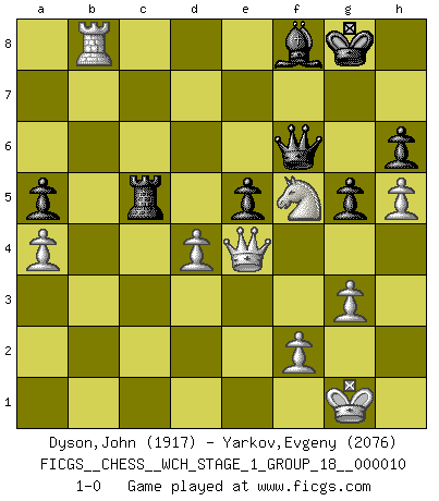 Last move : 1-0 2012 May 29 14:43:39 [Event "FICGS__CHESS__WCH_STAGE_1_GROUP_18__000010"] [Site "FICGS"] [Date "2012.01.01"] [Round "1"] [White "Dyson,John"] [Black "Yarkov,Evgeny"] [Result "1-0"] [WhiteElo "1917"] [BlackElo "2076"] 1.c4 c5 2.g3 g6 3.Bg2 Bg7 4.Nc3 Nc6 5.Nf3 e6 6.d3 Nge7 7.Bg5 h6 8.Bd2 O-O 9.Qc1 Kh7 10.Ne4 d6 11.h4 f5 12.Nc3 a6 13.Rb1 Rb8 14.a3 Nd4 15.b4 Nxf3+ 16.Bxf3 b6 17.bxc5 dxc5 18.Bf4 e5 19.Bd2 Bb7 20.Bxb7 Rxb7 21.h5 g5 22.Qc2 Qd7 23.Qa4 b5 24.cxb5 Rfb8 25.b6 Qe6 26.e4 Qd6 27.Qc4 Rxb6 28.Rxb6 Rxb6 29.Be3 Qc7 30.exf5 Qb7 31.O-O Nxf5 32.Bxc5 Rc6 33.Rb1 Qc7 34.Nd5 Qf7 35.Qe4 Rxc5 36.Ne3 Kg8 37.Nxf5 Bf8 38.a4 Qf6 39.Rb8 a5 40.d4 1-0 This chess game has been lost on time (started : 2012.01.01 23:40:28) English : Symmetrical variation Kingside Castling by player Black (move 8) Kingside Castling by player White (move 31) Player White won this chess game. Follow this game move after move (download)Look at Garry Kasparov. After he loses, invariably he wins the next game. He just kills the next guy. That's something that we have to learn to be able to do. (Maurice Ashley) Drei Punkte vor allen anderen ist wie einer, der im weißen Anzug posiert, während der Rest in Müllsäcke gekleidet dasteht. (Viktor Kortschnoi) En el Ajedrez, tal como es jugado por los Maestros, practicamente la suerte es eliminada. (Emanuel Lasker) Les écrivains ont utilisé les échecs pour analyser les côtés extrêmes de la nature humaine. Dans ce cadre, les échecs offrent un champ d'expérimentation idéal. Mais on pourrait faire la même chose avec la peinture. Et là, en vous référant à Van Gogh, vous ne tirerez pas de conclusion définitive sur les peintres. (Gary Kasparov) Horse racing is animated roulette. (Roger Kahn)