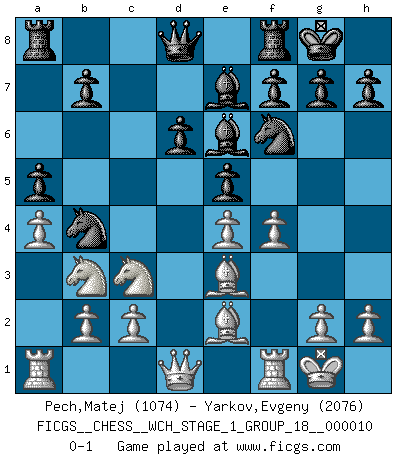 Last move : 0-1 2012 April 9 11:31:41 [Event "FICGS__CHESS__WCH_STAGE_1_GROUP_18__000010"] [Site "FICGS"] [Date "2012.01.01"] [Round "1"] [White "Pech,Matej"] [Black "Yarkov,Evgeny"] [Result "0-1"] [WhiteElo "1074"] [BlackElo "2076"] 1.e4 c5 2.Nf3 Nc6 3.d4 cxd4 4.Nxd4 Nf6 5.Nc3 d6 6.Be2 e5 7.Nb3 Be7 8.O-O O-O 9.Be3 a5 10.a4 Nb4 11.f4 Be6 0-1 This chess game has been lost on time (started : 2012.01.01 23:40:28) Sicilian : Boleslavsky variation, 7.Nb3 Kingside Castling by player White (move 8) Kingside Castling by player Black (move 8) Player Black won this chess game. Follow this game move after move (download)The blunders are all there on the board, waiting to be made. (Savielly Tartakover) Schach ist die gewalttätigste aller Sportarten. (Garry Kasparov) La estratégia requiere pensar, la táctica requiere observación. (Max Euwe) Seul un grand joueur sait à quel point il joue faiblement. (Xavier Tartacover) Being number two sucks. (Andre Agassi)