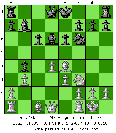 Last move : 0-1 2012 April 9 11:31:41 [Event "FICGS__CHESS__WCH_STAGE_1_GROUP_18__000010"] [Site "FICGS"] [Date "2012.01.01"] [Round "1"] [White "Pech,Matej"] [Black "Dyson,John"] [Result "0-1"] [WhiteElo "1074"] [BlackElo "1917"] 1.d4 d5 2.c4 c6 3.Nc3 e6 4.Nf3 Nf6 5.e3 Nbd7 6.Bd3 dxc4 7.Bxc4 b5 8.Bd3 Bb7 9.O-O b4 10.Ne4 Nxe4 11.Bxe4 Bd6 12.b3 Nf6 0-1 This chess game has been lost on time (started : 2012.01.01 23:40:28) QGD Slav defense Kingside Castling by player White (move 9) Player Black won this chess game. Follow this game move after move (download)In order to improve your game, you must study the endgame before everything else, for whereas the endings can be studied and mastered by themselves, the middle game and the opening must be studied in relation to the endgame. (Jose Raul Capablanca) Wenn es im Universum noch irgendwo intelligente Lebewesen gibt, dann kennen sie Go. (Emanuel Lasker) Aunque la mayoría de la gente disfruta observar las partidas de los grandes Maestros de ataque, algunos de los jugadores mas notables en la historia han sido los jugadores silenciosos posicionales. Lentamente ellos te aplastan despojandote de tu espacio, congestionando tus piezas y dejandote virtualmente sin nada que hacer. (Yasser Seirawan) Si le désir cupide (et stupide) de gagner est une inépuisable source de souffrance, une combinaison brillante sur l'échiquier est une découverte : le coquelicot qui s'épanouit lorsque apparaît la Voie Lactée. (Arrabal) Always be a first-rate version of yourself, instead of a second-rate version of somebody else. (Judy Garland)