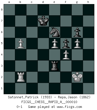 Last move : 0-1 2007 June 9 12:49:33 [Event "FICGS__CHESS__RAPID_A__000010"] [Site "FICGS"] [Date "2007.01.12"] [Round "1"] [White "Satonnet,Patrick"] [Black "Repa,Jason"] [Result "0-1"] [WhiteElo "1933"] [BlackElo "1862"] 1.e4 e6 2.d4 d5 3.Nd2 c5 4.exd5 exd5 5.Ngf3 Nf6 6.Bb5+ Bd7 7.Bxd7+ Nbxd7 8.O-O Be7 9.dxc5 Nxc5 10.Re1 O-O 11.Nf1 Re8 12.Be3 a5 13.Bd4 Ne6 14.Ne3 Nxd4 15.Nxd4 Qb6 16.Qd3 Bc5 17.c3 Rac8 18.Re2 Bxd4 19.cxd4 g6 20.Rae1 Re7 21.h4 Qd6 22.h5 Rce8 23.hxg6 hxg6 24.Nd1 Rxe2 25.Rxe2 Rc8 26.Nc3 Rc4 27.g3 Kg7 28.Kg2 Qb6 29.Rd2 Qe6 30.f3 Rc8 31.Re2 Qb6 32.g4 Rc4 33.Rd2 Qe6 34.Rd1 a4 35.a3 Nd7 36.Qd2 Nf8 37.Kg3 Qc6 38.Rh1 Qd6+ 39.Kg2 f6 40.Qh6+ Kf7 41.Re1 Qc6 42.Rd1 b5 43.g5 f5 44.Qh2 b4 45.axb4 a3 46.Qe5 axb2 47.Nxd5 Qe6 48.Rb1 Qxe5 49.dxe5 Ke6 50.Ne3 Rc3 51.f4 Rxe3 52.Rxb2 Kd7 53.b5 Ne6 0-1 This chess game has been lost on time (started : 2007.01.12 18:14:12) French : Tarrasch, Open, 4.ed ed Kingside Castling by player White (move 8) Kingside Castling by player Black (move 10) Player Black won this chess game. Follow this game move after move (download)All my games are real. (Bobby Fischer) Wenn ich Weiß habe gewinne ich weil ich Weiß habe, wenn ich Schwarz habe gewinne ich weil ich Bogoljubov bin. (Efim Bogoljubov) Si el ingenio solamente fuese necesario para lucirse, las mujeres serían las mejores jugadoras de Ajedrez del mundo. (Albin) Les échecs, c'est l'imagination. (David Bronstein) See no evil, hear no evil, speak no evil. (The 3 monkeys)