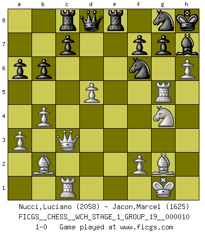 Last move : 1-0 2012 February 25 20:44:44 [Event "FICGS__CHESS__WCH_STAGE_1_GROUP_19__000010"] [Site "FICGS"] [Date "2012.01.01"] [Round "1"] [White "Nucci,Luciano"] [Black "Jacon,Marcel"] [Result "1-0"] [WhiteElo "2058"] [BlackElo "1625"] 1.d4 Nf6 2.c4 e6 3.g3 d5 4.Bg2 dxc4 5.Nf3 a6 6.O-O Nc6 7.e3 Bd7 8.Qe2 Bd6 9.Qxc4 O-O 10.Nc3 Rb8 11.a3 Na5 12.Qa2 Nc6 13.b4 e5 14.Re1 h6 15.Bb2 exd4 16.exd4 Ne7 17.Ne5 Be6 18.d5 Bf5 19.Nd1 Bxe5 20.Rxe5 Re8 21.Qc4 Bg6 22.Qc3 b6 23.Ne3 Qd7 24.Rc1 Rbd8 25.h4 Rc8 26.g4 Kh8 27.h5 Bh7 28.g5 hxg5 29.Rxg5 Neg8 30.Ng4 Qd8 31.h6 1-0 Catalan : Open, 5.Nf3 Kingside Castling by player White (move 6) Kingside Castling by player Black (move 9) Player White won this chess game. Follow this game move after move (download)I believe that Chess possesses a magic that is also a help in advanced age. A rheumatic knee is forgotten during a game of Chess and other events can seem quite unimportant in comparison with a catastrophe on the chessboard. (Vlastimil Hort) Vielleicht wirkt die Aura früherer Spieler glanzvoller als die der heutigen Spieler, aber das liegt daran, dass man kein Programm wie Fritz hatte, das einem all die Löcher in ihren Partien zeigt. (Vladimir Kramnik) Aunque la mayoría de la gente disfruta observar las partidas de los grandes Maestros de ataque, algunos de los jugadores mas notables en la historia han sido los jugadores silenciosos posicionales. Lentamente ellos te aplastan despojandote de tu espacio, congestionando tus piezas y dejandote virtualmente sin nada que hacer. (Yasser Seirawan) 'L'échange des dames est un coup dur pour les deux adversaires...' Un journaliste lors d'une partie du match Spassky-Fischer SEO proverb : Make your website optimized for human beings, not for search engines.