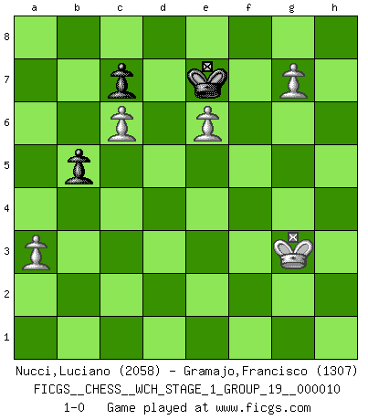 Last move : 1-0 2012 May 25 22:40:2 [Event "FICGS__CHESS__WCH_STAGE_1_GROUP_19__000010"] [Site "FICGS"] [Date "2012.02.19"] [Round "1"] [White "Nucci,Luciano"] [Black "Gramajo,Francisco"] [Result "1-0"] [WhiteElo "2058"] [BlackElo "1307"] 1.d4 Nf6 2.c4 e6 3.g3 d5 4.Bg2 Nc6 5.Nf3 Bb4+ 6.Nbd2 a5 7.a3 Be7 8.b3 O-O 9.O-O Ne4 10.Bb2 f5 11.Rc1 Qd7 12.Qc2 Qd8 13.Ne1 Bd7 14.e3 Bd6 15.Nd3 Qe8 16.Ne5 Be7 17.Nxe4 fxe4 18.Nxd7 Qxd7 19.Qe2 Bf6 20.Bh3 Qd6 21.f3 exf3 22.Rxf3 Rae8 23.Qc2 Rf7 24.Kg2 Nd8 25.Rcf1 Ref8 26.e4 dxe4 27.Qxe4 b6 28.R3f2 h5 29.Rd1 a4 30.bxa4 Qd7 31.Re1 Qxa4 32.Bxe6 Nxe6 33.Qxe6 Qa8+ 34.Kh3 Qa4 35.Re4 Qd7 36.d5 Bxb2 37.Rxb2 Qxe6+ 38.dxe6 Re7 39.Kh4 Rf5 40.Rb5 Rf2 41.h3 Rf6 42.Rbe5 Rh6 43.c5 b5 44.c6 Kf8 45.Kg5 Kg8 46.Kf4 Rg6 47.Kf3 Kf8 48.g4 Rf6+ 49.Kg3 hxg4 50.hxg4 Rf1 51.Rf5+ Rxf5 52.gxf5 Ke8 53.Rh4 Kd8 54.Rh7 g6 55.Rh8+ Re8 56.Rxe8+ Kxe8 57.fxg6 Ke7 58.g7 1-0 Catalan : Closed Kingside Castling by player Black (move 8) Kingside Castling by player White (move 9) 10 pieces endgame at move 56 : White KRPPPP , Black KPPP WHITE : King + 1 Rook 4 Pawns BLACK : King + 3 Pawns 9 pieces endgame at move 56 : White KPPPP , Black KPPP WHITE : King + 4 Pawns BLACK : King + 3 Pawns 8 pieces endgame at move 57 : White KPPPP , Black KPP WHITE : King + 4 Pawns BLACK : King + 2 Pawns Player White won this chess game. Follow this game move after move (download)Chess is as much a mystery as women. (Purdy) Kein Großmeister ist normal. Sie unterscheiden sich nur im Ausmaß Ihrer Verrücktheit. (Viktor Kortschnoi) Un sacrificio se refuta mucho mejor al aceptarlo. (Wilhelm Steinitz) Toute estimation doit être constamment réévaluée. (Jacob Estrin) If things go wrong, don't go with them. (Roger Babson)