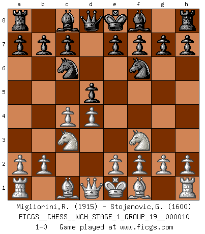 Last move : 1-0 2012 February 8 19:14:12 [Event "FICGS__CHESS__WCH_STAGE_1_GROUP_19__000010"] [Site "FICGS"] [Date "2012.01.01"] [Round "1"] [White "Migliorini,Roberto"] [Black "Stojanovic,Goran"] [Result "1-0"] [WhiteElo "1915"] [BlackElo "1600"] 1.Nf3 Nc6 2.d4 d5 3.c4 Nf6 4.Nc3 1-0 This chess game has been lost on time (started : 2012.01.01 23:41:26) Reti Opening Player White won this chess game. Follow this game move after move (download)All that matters on the Chessboard is good moves. (Bobby Fischer) Schach ist das schnellste Spiel der Welt, weil man in jeder Sekunde Tausende von Gedanken ordnen muß. (Albert Einstein) Tu puedes aprender mucho mas de una partida que pierdas que de una partida ganada. Tendras que perder cientos de partidas antes de llegar a ser un buen jugador. (Jose Raul Capablanca) Si le désir cupide (et stupide) de gagner est une inépuisable source de souffrance, une combinaison brillante sur l'échiquier est une découverte : le coquelicot qui s'épanouit lorsque apparaît la Voie Lactée. (Arrabal) Waiting for chance ? Play in casinos. (FICGS proverb)
