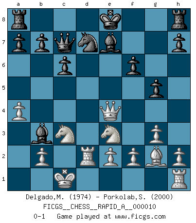 Last move : 0-1 2007 April 3 9:37:43 [Event "FICGS__CHESS__RAPID_A__000010"] [Site "FICGS"] [Date "2007.01.12"] [Round "1"] [White "Delgado,Mauricio"] [Black "Porkolab,Sandor"] [Result "0-1"] [WhiteElo "1974"] [BlackElo "2000"] 1.d4 d5 2.c4 c6 3.Nc3 Nf6 4.Nf3 dxc4 5.a4 Bf5 6.Ne5 Nbd7 7.Nxc4 Qc7 8.g3 e5 9.dxe5 Nxe5 10.Bf4 Nfd7 11.Bg2 g5 12.Bxe5 Nxe5 13.Qd4 f6 14.O-O-O Be7 15.Ne3 Be6 16.Qe4 Bb3 17.Rd2 Nd7 0-1 This chess game has been lost on time (started : 2007.01.12 18:14:12) QGD Slav defense Queenside Castling by player White (move 14) Player Black won this chess game. Follow this game move after move (download)The tactician must know what to do whenever something needs doing; the strategist must know what to do when nothing needs doing. (Savielly Tartakover) Fischer machte Schach einfach zu einer aufregenden Sache, wann immer er sich ans Brett setzte. (Raymond Keene) La señal de un Gran Maestro es su habilidad de ganar una partida rápidamente y sin dolor. (Irving Chernev) Les Echecs ne sont pas pour les âmes timides. Ils requièrent un homme entier, qui ne s'arrête pas aveuglément à ce qui a été déjà établi, mais qui tente individuellement de sonder les profondeurs du jeu. (W. Steinitz) Games, world of games... There's always an opponent, and there's always a victim. (Revolver, movie)