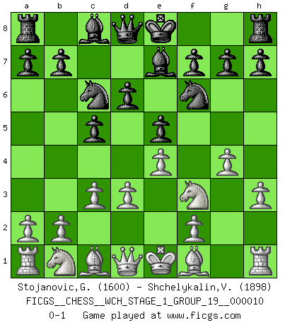 Last move : 0-1 2012 February 15 19:45:46 [Event "FICGS__CHESS__WCH_STAGE_1_GROUP_19__000010"] [Site "FICGS"] [Date "2012.01.01"] [Round "1"] [White "Stojanovic,Goran"] [Black "Shchelykalin,Vyacheslav"] [Result "0-1"] [WhiteElo "1600"] [BlackElo "1898"] 1.e4 c5 2.Nf3 d6 3.d3 Nc6 4.c3 Nf6 5.h3 e5 6.g4 Be7 0-1 This chess game has been lost on time (started : 2012.01.01 23:41:26) Sicilian Player Black won this chess game. Follow this game move after move (download)I look one move ahead... the best ! (Siegbert Tarrasch) Ich glaube nicht an Psychologie, ich glaube an gute Züge. (Robert James Fischer) Las ideas audaces son como las piezas del Ajedrez que avanzan hacia adelante. Ellas pueden ser vencidas, pero también pueden iniciar una partida victoriosa. (Goethe) Roi des jeux et jeu des rois, les échecs portent en eux un sentiment d'infini. Ils donnent à celui qui s'est efforcé d'en approfondir les arcanes l'impression de n'être pas à la mesure de l'homme; en fait, ils constituent un résumé de l'univers, un microcosme, et figurent cette grande échelle qui, dans les plans de la lumière descend jusqu'à la matière, qui des abîmes insondables remonte jusqu'en l'infini de Dieu. (Pyrame) The beginning of wisdom is silence. The second step is listening. (Unknown)