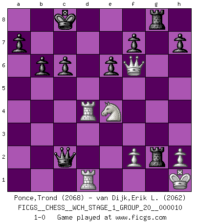 Last move : 1-0 2012 April 4 0:29:47 [Event "FICGS__CHESS__WCH_STAGE_1_GROUP_20__000010"] [Site "FICGS"] [Date "2012.01.01"] [Round "1"] [White "Ponce,Trond"] [Black "van Dijk,Erik L."] [Result "1-0"] [WhiteElo "2068"] [BlackElo "2062"] 1.e4 e6 2.d4 d5 3.Nc3 Nf6 4.Bg5 Bb4 5.exd5 Qxd5 6.Bxf6 Bxc3+ 7.bxc3 gxf6 8.Qg4 Qa5 9.Ne2 Bd7 10.Qf3 Ke7 11.Nf4 Nc6 12.Rd1 Qxa2 13.Bd3 Qa5 14.O-O Rag8 15.Rfe1 Kd8 16.Nh5 f5 17.Nf6 Qxc3 18.Re3 Qb2 19.Bxf5 Nxd4 20.Qh5 Rg7 21.Be4 Kc8 22.Red3 Bc6 23.Rxd4 Bxe4 24.Nxe4 Qxc2 25.Qh4 b6 26.Qf6 Rhg8 27.Qf3 Rxg2+ 28.Kh1 c6 29.Qf6 1-0 French : MacCutcheon variation Kingside Castling by player White (move 14) Player White won this chess game. Follow this game move after move (download)Capture of the adverse King is the ultimate but not the first object of the game. (William Steinitz) Taktik ist was man tun muß, wenn etwas zu tun ist. Strategie ist was man tun muß, wenn nichts zu tun ist. (Savielly Grigorievitsch Tartakower) Del Ajedrez se ha dicho que la vida no es lo suficientemente larga para él, pero eso es culpa de la vida, no del Ajedrez. (William Ewart Napier) RxDa4 pat (...) There are two types of people in this world, good and bad. The good sleep better, but the bad seem to enjoy the waking hours much more. (Woody Allen)