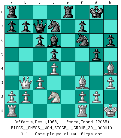 Last move : 0-1 2012 February 26 0:29:23 [Event "FICGS__CHESS__WCH_STAGE_1_GROUP_20__000010"] [Site "FICGS"] [Date "2012.01.01"] [Round "1"] [White "Jefferis,Des"] [Black "Ponce,Trond"] [Result "0-1"] [WhiteElo "1063"] [BlackElo "2068"] 1.e4 e6 2.Nf3 d5 3.exd5 exd5 4.d4 Nf6 5.Be2 Bd6 6.O-O O-O 7.c3 Re8 8.Bg5 h6 9.Bh4 Bg4 10.h3 Bxf3 11.Bxf3 Nbd7 12.Kh1 c6 13.Nd2 Qc7 14.Qb3 g5 0-1 French defense Kingside Castling by player White (move 6) Kingside Castling by player Black (move 6) Player Black won this chess game. Follow this game move after move (download)I like to say that Bobby Fischer was the greatest player ever. But what made Fischer a genius was his ability to blend an American freshness and pragmatism with Russian ideas about strategy. (Bruce Pandolfini) Jeder Schachmeister war einmal ein Anfänger. (Irving Chernev) Una de estas pequeñas movidas modestas pudieran ser mas molestas a tu oponente que la amenaza mas grande. (Siegbert Tarrasch) Le système Elo représente seulement une moyenne. Il est simplement un indicateur de votre stabilité. (Anatoli Karpov) There is no instance of a country having benefited from prolonged warfare. (Sun Tzu)