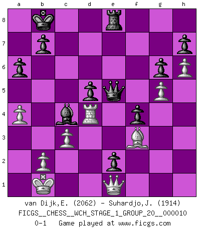 Last move : 0-1 2012 August 19 0:50:47 [Event "FICGS__CHESS__WCH_STAGE_1_GROUP_20__000010"] [Site "FICGS"] [Date "2012.01.01"] [Round "1"] [White "van Dijk,Erik L."] [Black "Suhardjo,Johanes"] [Result "0-1"] [WhiteElo "2062"] [BlackElo "1914"] 1.e4 c5 2.Nf3 e6 3.d4 cxd4 4.Nxd4 Nf6 5.Nc3 Qb6 6.e5 Bc5 7.Be3 Nd5 8.Be2 Nxe3 9.fxe3 Nc6 10.Ne4 Nxd4 11.exd4 Bxd4 12.Nd6+ Ke7 13.Nc4 Qc5 14.Qd2 f6 15.O-O-O Bxe5 16.Nxe5 Qxe5 17.h4 d5 18.Rh3 Qc7 19.g4 Bd7 20.g5 Rac8 21.Kb1 Qd6 22.Ra3 a6 23.h5 Rhf8 24.Rb3 Rc7 25.Rf3 f5 26.Rc3 Rxc3 27.Qxc3 e5 28.Qg3 Bc6 29.Qh4 Kd7 30.c3 Kc7 31.Qf2 Kb8 32.Qb6 Rd8 33.Qf2 g6 34.h6 f4 35.Bf3 Qe7 36.Qh4 Qc7 37.Bg2 e4 38.Qf2 e3 39.Qe2 Bb5 40.Qe1 Qe5 41.Rd4 e2 42.a4 Bc4 43.Bf3 Re8 0-1 Sicilian : Anderssen variation Queenside Castling by player White (move 15) Player Black won this chess game. Follow this game move after move (download)In a gambit you give up a Pawn for the sake of getting a lost game. (Samuel Standige Boden) Modernes Schach sorgt sich zuviel um Dinge wie Bauernstruktur usw. Vergessen Sie das, Schachmatt beendet das Spiel! (Nigel Short) La captura del Rey enemigo es la finalidad pero no el primer objetivo de la partida. (William Steinitz) Ce qui est bien, c'est d'avoir tout un tas de pièces en prise : l'adversaire ne peut en prendre qu'une à la fois. Cité par Thierry Audin. The mind is like a parachute, it only functions when its open. (Unknown)