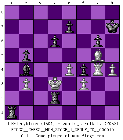 Last move : 0-1 2012 March 22 6:24:59 [Event "FICGS__CHESS__WCH_STAGE_1_GROUP_20__000010"] [Site "FICGS"] [Date "2012.01.01"] [Round "1"] [White "O Brien,Glenn"] [Black "van Dijk,Erik L."] [Result "0-1"] [WhiteElo "1601"] [BlackElo "2062"] 1.e4 c5 2.Nf3 d6 3.d4 Nf6 4.Nc3 cxd4 5.Nxd4 g6 6.Be3 Bg7 7.f3 O-O 8.Qd2 Nc6 9.Bc4 Bd7 10.O-O-O Rc8 11.Bb3 Ne5 12.h4 h5 13.Bg5 a6 14.Kb1 b5 15.g4 Nc4 16.Bxc4 Rxc4 17.gxh5 Nxh5 18.Nde2 Be6 19.b3 Rc7 20.Nd4 Qc8 21.Nce2 Kh7 22.Qb4 f6 23.Nxe6 Qxe6 24.Be3 Qc8 25.Rd2 f5 26.Bg5 f4 27.Rg1 Ng3 28.Rgd1 Nxe2 29.Rxe2 Qh3 30.Rf2 Bc3 31.Qa3 a5 32.Qc1 Qg3 33.R2f1 a4 34.Rd3 axb3 35.cxb3 Qg2 36.Rg1 Qf2 37.Rg4 Qxa2+ 38.Kxa2 Ra8+ 39.Qa3 Rxa3+ 40.Kb1 Ra1+ 41.Kc2 Bb4 42.Rc3 Rxc3+ 43.Kd2 Re3 44.Kc2 Re2+ 45.Kd3 Rd2+ 0-1 Sicilian Kingside Castling by player Black (move 7) Queenside Castling by player White (move 10) Player Black won this chess game. Follow this game move after move (download)On the chessboard, lies and hypocrisy do not survive long. (Emanuel Lasker) Mein Name ist Rustam Kamsky. Sie haben meinen Sohn belästigt. Bereiten Sie sich aufs Sterben vor. (Rustam Kamsky) Realmente no sabemos como el juego fue inventado, aunque hay sospechas. Tan pronto como descubramos a los culpables, se los haremos saber. (Bruce Pandolfini) Je crois qu'il existe des manières très spécifiques de jouer efficacement contre une machine. Evidemment, nous n'avons aucune chance en technique pure, parce que l'ordinateur calcule de manière parfaite. Mais lorsque nous faisons appel à notre cerveau, en utilisant l'intuition et la compréhension, alors nous restons beaucoup plus forts. (Anatoli Karpov) Inventor: A person who makes an ingenious arrangement of wheels, levers and springs, and believes it civilization. (Ambrose Bierce, The Devil's Dictionary)