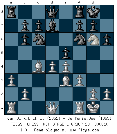 Last move : 1-0 2012 February 7 20:4:13 [Event "FICGS__CHESS__WCH_STAGE_1_GROUP_20__000010"] [Site "FICGS"] [Date "2012.01.01"] [Round "1"] [White "van Dijk,Erik L."] [Black "Jefferis,Des"] [Result "1-0"] [WhiteElo "2062"] [BlackElo "1063"] 1.d4 d5 2.c4 dxc4 3.e4 e6 4.Bxc4 Nf6 5.Nc3 Bb4 6.f3 Nc6 7.Nge2 h6 8.a3 Ba5 9.Be3 O-O 10.O-O Bb6 11.Na4 Bd7 12.Nxb6 axb6 13.Nf4 e5 14.Ng6 1-0 QGA : 3.e4 Kingside Castling by player Black (move 9) Kingside Castling by player White (move 10) Player White won this chess game. Follow this game move after move (download)The defensive power of a pinned piece is only imaginary. (Aaron Nimzovich) Frage: Wie viele Autos haben Sie schon zerstört? - Antwort: Nur zwei. (Loek van Wely) Muchos jugadores de Ajedrez se sorprendían cuando después de la partida, Fischer explicaba con calma: 'Yo ya había analizado esta posibilidad' en una posición en la cual yo creía que no era posible de prever desde la apertura. (Mikhail Tal) Les Echecs ne sont pas pour les âmes timides. Ils requièrent un homme entier, qui ne s'arrête pas aveuglément à ce qui a été déjà établi, mais qui tente individuellement de sonder les profondeurs du jeu. (W. Steinitz) Shallow men believe in luck. Strong men belive in cause and effect. (Ralph Waldo Emerson)