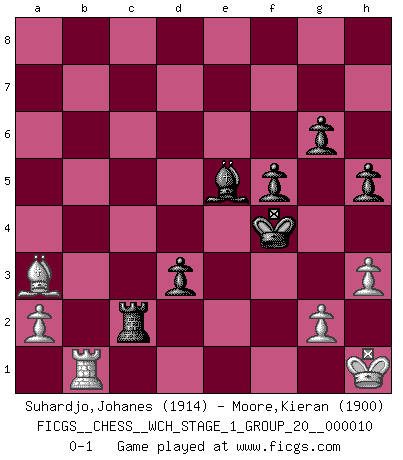 Last move : 0-1 2012 April 3 5:53:12 [Event "FICGS__CHESS__WCH_STAGE_1_GROUP_20__000010"] [Site "FICGS"] [Date "2012.01.01"] [Round "1"] [White "Suhardjo,Johanes"] [Black "Moore,Kieran"] [Result "0-1"] [WhiteElo "1914"] [BlackElo "1900"] 1.e4 c5 2.Nf3 e6 3.d4 cxd4 4.Nxd4 a6 5.f4 Nc6 6.Nxc6 bxc6 7.Bd3 d5 8.O-O Nf6 9.e5 Nd7 10.c3 Qb6+ 11.Kh1 a5 12.b3 Ba6 13.Bxa6 Qxa6 14.f5 exf5 15.c4 g6 16.cxd5 Nxe5 17.dxc6 Qxc6 18.Bb2 Bg7 19.Ba3 Qd7 20.Qc1 Rc8 21.Qe1 f6 22.Nc3 Qb7 23.Rd1 Kf7 24.Rf2 Rhe8 25.Re2 h5 26.Na4 Bh6 27.h3 Red8 28.Bd6 Bf4 29.Qf1 Qb5 30.Ba3 Rxd1 31.Qxd1 Kg7 32.Re1 Bg3 33.Qe2 Qc6 34.Rd1 Qe4 35.Qxe4 fxe4 36.Rc1 Re8 37.Nc3 Nd3 38.Rb1 f5 39.Ne2 Be5 40.b4 axb4 41.Bxb4 Rc8 42.Ba3 Rc2 43.Nc1 Kf6 44.Rb6+ Kg5 45.Rb1 Kf4 46.Nxd3+ exd3 0-1 Sicilian : Kan variation Kingside Castling by player White (move 8) Player Black won this chess game. Follow this game move after move (download)I have added these principles to the law: get the Knights into action before both Bishops are developed. (Emanuel Lasker) Offener Brief an US-Präsident Bush anlässlich der Verhaftung Bobby Fishers: Verhaften Sie mich. Stecken Sie mich in dieselbe Zelle wie Bobby Fisher und geben Sie uns ein Schachspiel mit. (Boris Vassilievich Spassky) Mis oponentes también hacen buenas movidas. A veces yo no tomo esas cosas en consideración. (Bobby Fischer) Comme les marins qui ont mille raisons différentes d'aller en mer, les joueurs d'échecs en ont tout autant avant de s'installer devant une table et jouer... (Vincent Bertignac, philosophe) Art disturbs, science reassures. (Georges Braque, Le Jour et la Nuit)