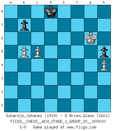 Last move : 1-0 2012 March 29 6:48:54 [Event "FICGS__CHESS__WCH_STAGE_1_GROUP_20__000010"] [Site "FICGS"] [Date "2012.01.01"] [Round "1"] [White "Suhardjo,Johanes"] [Black "O Brien,Glenn"] [Result "1-0"] [WhiteElo "1914"] [BlackElo "1601"] 1.d4 Nf6 2.Nc3 d5 3.Bg5 Nbd7 4.f3 c6 5.e4 dxe4 6.fxe4 e5 7.dxe5 Qa5 8.Bxf6 gxf6 9.e6 fxe6 10.Qg4 Nb6 11.O-O-O Bh6+ 12.Kb1 Bd7 13.Nf3 O-O-O 14.Be2 Rhg8 15.Qh4 Rg6 16.e5 f5 17.h3 Nd5 18.Nxd5 cxd5 19.g4 Rh8 20.Bd3 Be3 21.gxf5 exf5 22.Qe1 Qc5 23.e6 Rxe6 24.Bxf5 Re7 25.Bxd7+ Kxd7 26.Rd3 Rf8 27.Qh4 Rf4 28.Qg5 Ke8 29.Rxd5 Qb6 30.Rhd1 Rxf3 31.Qg8+ Rf8 32.Rd8+ Qxd8 33.Rxd8+ Kxd8 34.Qxf8+ Kd7 35.c4 Ke6 36.Kc2 Bb6 37.b4 Be3 38.Kd3 Bb6 39.c5 Bd8 40.Qxd8 Rd7+ 41.Qxd7+ Kxd7 42.b5 Ke6 43.Ke4 h6 44.h4 Kd7 45.Kf5 a6 46.a4 axb5 47.axb5 h5 48.Kf6 Kd8 49.Kg6 1-0 Queen's pawn game Queenside Castling by player White (move 11) Queenside Castling by player Black (move 13) 10 pieces endgame at move 41 : White KQPPPP , Black KPPP WHITE : King + 1 Queen 4 Pawns BLACK : King + 3 Pawns 9 pieces endgame at move 41 : White KPPPP , Black KPPP WHITE : King + 4 Pawns BLACK : King + 3 Pawns 8 pieces endgame at move 46 : White KPPP , Black KPPP WHITE : King + 3 Pawns BLACK : King + 3 Pawns 7 pieces endgame at move 47 : White KPPP , Black KPP WHITE : King + 3 Pawns BLACK : King + 2 Pawns Player White won this chess game. Follow this game move after move (download)Robert Fischer is a law unto himself. (Larry Evans) Ich suche im Schach immer etwas Eigenes. Riskantes Spiel im Stile schachlicher Musketiere ist nicht meine Sache, auch wenn es vielen Freunden scharfer Wendungen gefällt. (Anatoly Karpov) ¿Que sería del Ajedrez sin errores graciosos?. (Kurt Richter) La victoire dans une partie d'Echecs appartient la plupart du temps à celui qui voit un peu plus loin que l'adversaire. (Lasker) A good book on your shelf is a friend that turns its back on you and remains a friend. (Author unknown)