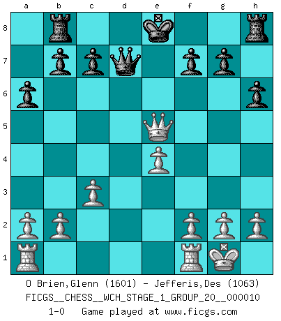 Last move : 1-0 2012 February 18 11:21:56 [Event "FICGS__CHESS__WCH_STAGE_1_GROUP_20__000010"] [Site "FICGS"] [Date "2012.01.01"] [Round "1"] [White "O Brien,Glenn"] [Black "Jefferis,Des"] [Result "1-0"] [WhiteElo "1601"] [BlackElo "1063"] 1.e4 e5 2.Nf3 Nc6 3.Bb5 d6 4.d4 Be7 5.dxe5 dxe5 6.O-O Bd7 7.Nc3 Bd6 8.Nd5 Nge7 9.Bg5 a6 10.Ba4 h6 11.Bxe7 Nxe7 12.Bxd7+ Qxd7 13.c3 Nxd5 14.Qxd5 Rb8 15.Nxe5 Bxe5 16.Qxe5+ 1-0 Ruy Lopez : Old Steinitz defense Kingside Castling by player White (move 6) Player White won this chess game. Follow this game move after move (download)Some sacrifices are sound; the rest are mine. (Mikhail Tal) Im Hotelzimmer gab es nur zwei Schaben. (Über die Turnierbedingungen) (Peter Swidler) Todos los Maestros de Ajedrez fueron un día unos principiantes. (Chernev) Il a essayé de se convaincre qu'il pourrait empêcher toutes les erreurs et ne jamais perdre. L'horreur ! Gary Kasparov au sujet de Robert Fischer. Without enthusiasm, virtue functions not at all, and vice only poorly. (Mignon McLaughlin, The Neurotic's Notebook, 1960)