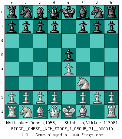 Last move : 1-0 2012 February 2 18:45:45 [Event "FICGS__CHESS__WCH_STAGE_1_GROUP_21__000010"] [Site "FICGS"] [Date "2012.01.01"] [Round "1"] [White "Whittaker,Deon"] [Black "Shishkin,Viktor"] [Result "1-0"] [WhiteElo "1058"] [BlackElo "1908"] 1.e4 e5 2.Nf3 1-0 This chess game has been lost on time (started : 2012.01.01 23:43:38) King's knight Opening Player White won this chess game. Follow this game move after move (download)A passed Pawn increases in strength as the number of pieces on the board diminishes. (Capablanca) Herr Iljumschinow ist ein etwas merkwürdiger Geschäftsmann: Er arbeitet zusammen mit Leuten wie Muammar al-Gaddafi; früher ist das Saddam Hussein gewesen. (Joel Lautier) Uno no tiene que jugar muy bien, es suficiente jugar mejor que el oponente. (Siegbert Tarrasch) Aidez vos pièces, elles vous aideront. (Paul Morphy) It is a good thing for an uneducated man to read books of quotations. (Winston Churchill)