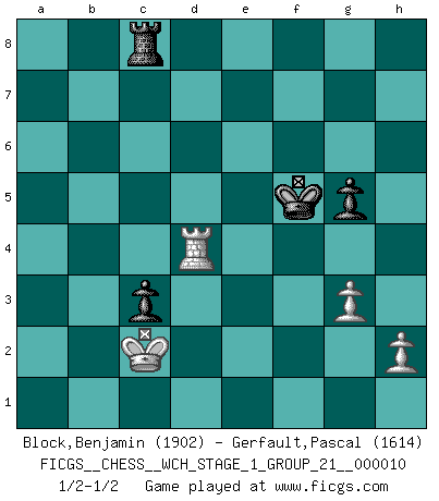 Last move : 1/2-1/2 2012 May 9 19:42:32 [Event "FICGS__CHESS__WCH_STAGE_1_GROUP_21__000010"] [Site "FICGS"] [Date "2012.01.01"] [Round "1"] [White "Block,Benjamin"] [Black "Gerfault,Pascal"] [Result "1/2-1/2"] [WhiteElo "1902"] [BlackElo "1614"] 1.e4 e6 2.d4 d5 3.Nc3 Bb4 4.e5 c5 5.f4 Ne7 6.a3 Ba5 7.Nf3 Nbc6 8.dxc5 d4 9.b4 Nxb4 10.axb4 Bxb4 11.Bb5+ Bd7 12.Qxd4 Bxc3+ 13.Qxc3 Bxb5 14.Nd4 Qd7 15.Kf2 Bc6 16.Be3 Qd5 17.Nxc6 Qxc6 18.Qd3 O-O 19.Qd6 Qe8 20.Rhd1 Nd5 21.c4 Nxe3 22.Kxe3 f6 23.Rab1 fxe5 24.Qxe5 Rf7 25.Rd6 Qa4 26.Rbd1 Raf8 27.Qxe6 Qa3+ 28.Ke4 Qxc5 29.g3 a5 30.R1d4 a4 31.Rd7 Qc8 32.Kd3 a3 33.Qxf7+ Rxf7 34.Rd8+ Rf8 35.Rxc8 Rxc8 36.Kc3 b5 37.Kb3 bxc4+ 38.Kxa3 Kf7 39.Kb2 c3+ 40.Kc2 Kf6 41.Rd5 h6 42.Rd6+ Kf5 43.Rd7 g5 44.fxg5 hxg5 45.Rd4 1/2-1/2 French : Winawer, Advance variation Kingside Castling by player Black (move 18) 10 pieces endgame at move 38 : White KRPPP , Black KRPPP WHITE : King + 1 Rook 3 Pawns BLACK : King + 1 Rook 3 Pawns 9 pieces endgame at move 44 : White KRPPP , Black KRPP WHITE : King + 1 Rook 3 Pawns BLACK : King + 1 Rook 2 Pawns 8 pieces endgame at move 44 : White KRPP , Black KRPP WHITE : King + 1 Rook 2 Pawns BLACK : King + 1 Rook 2 Pawns This chess game ended in a draw. Follow this game move after move (download)What is the object of playing a gambit opening?... To acquire a reputation of being a dashing player at the cost of losing a game. (Siegbert Tarrasch) Irgendwie scheint mir sonntags früh um 9 Uhr der Killerinstinkt verloren gegangen zu sein. (Alexej Shirov) Cada Peón es una Reina en potencia. (James Mason) Tout change constamment, y compris dans le monde des Echecs. (Botvinnik) Better than a thousand days of diligent study is one day with a great teacher. (Japanese proverb)