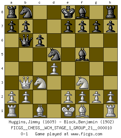Last move : 0-1 2012 March 23 6:1:35 [Event "FICGS__CHESS__WCH_STAGE_1_GROUP_21__000010"] [Site "FICGS"] [Date "2012.01.01"] [Round "1"] [White "Huggins,Jimmy"] [Black "Block,Benjamin"] [Result "0-1"] [WhiteElo "1609"] [BlackElo "1902"] 1.d4 d5 2.c4 c6 3.Nf3 Nf6 4.Nc3 Bf5 5.cxd5 Nxd5 6.Qb3 Qb6 0-1 QGD Slav : 4.Nc3 Player Black won this chess game. Follow this game move after move (download)For surely of all the drugs in the world, Chess must be the most permanently pleasurable. (Assiac) Schach wird sich dank seiner hohen kulturellen Tradition immer durchsetzen. In näherer Zukunft womöglich sogar als Gegenreaktion auf die maßlose Reizüberflutung im Freizeit- und Spielbereich. (Garry Kasparov) El Ajedrez es tortura mental. (Garry Kasparov) Le thème de l'attaque double intervient d'une manière ou d'une autre dans l'immense majorité des combinaisons. (Youri Averbakh) Creativity is inventing, experimenting, growing, taking risks, breaking rules, making mistakes, and having fun. (Mary Lou Cook)