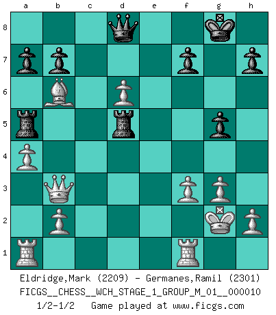 Last move : 1/2-1/2 2012 March 10 13:18:46 [Event "FICGS__CHESS__WCH_STAGE_1_GROUP_M_01__000010"] [Site "FICGS"] [Date "2012.01.01"] [Round "1"] [White "Eldridge,Mark"] [Black "Germanes,Ramil"] [Result "1/2-1/2"] [WhiteElo "2209"] [BlackElo "2301"] 1.c4 e5 2.Nc3 Nf6 3.g3 Bb4 4.Bg2 O-O 5.Nf3 Re8 6.O-O d6 7.Nd5 Nxd5 8.cxd5 e4 9.Ne1 Bc5 10.d3 Bf5 11.dxe4 Bxe4 12.Nd3 Bb6 13.Bxe4 Rxe4 14.Kg2 Nd7 15.f3 Re8 16.e4 c6 17.Nf4 Nf6 18.a4 cxd5 19.Nxd5 Nxd5 20.Qxd5 Rc8 21.Qd3 d5 22.exd5 Re5 23.d6 R8c5 24.Bf4 Rcd5 25.Qc2 Rc5 26.Qd1 Red5 27.Qb3 g5 28.Be3 Ra5 29.Bxb6 1/2-1/2 English : Bremen, Smyslov system Kingside Castling by player Black (move 4) Kingside Castling by player White (move 6) This chess game ended in a draw. Follow this game move after move (download)Chess is not like life... it has rules ! (Mark Pasternak) Capablanka war das größte Genie der Schachgeschichte! Aber denken sie nicht er habe nichts vom Schach verstanden. Er wusste nur soviel wie er wissen musste um seine Ziele zu erreichen. (Mikhail Moiseyevich Botvinik) La vida es como un juego de Ajedrez, cambiando con cada movimiento. (Proverbio Chino) Psychologiquement, tu dois avoir confiance en toi même, mais cette confiance doit être basée sur des faits. (Robert Fischer) What doesn't kill us makes us stronger. (Friedrich Nietzsche)