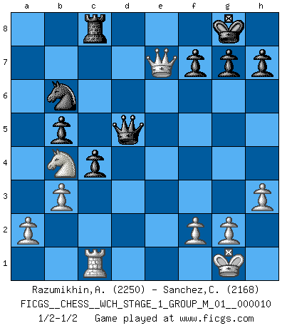Last move : 1/2-1/2 2012 March 31 12:18:38 [Event "FICGS__CHESS__WCH_STAGE_1_GROUP_M_01__000010"] [Site "FICGS"] [Date "2012.01.01"] [Round "1"] [White "Razumikhin,Andrey"] [Black "Sanchez,Carlos"] [Result "1/2-1/2"] [WhiteElo "2250"] [BlackElo "2168"] 1.e4 e5 2.Nf3 Nc6 3.Bb5 a6 4.Ba4 Nf6 5.O-O Be7 6.Re1 b5 7.Bb3 O-O 8.h3 Bb7 9.c3 d5 10.exd5 Nxd5 11.d4 exd4 12.cxd4 Re8 13.Nc3 Na5 14.Bxd5 Bxd5 15.Bf4 Bb7 16.Qd3 Nc4 17.Re2 Bf8 18.Rxe8 Qxe8 19.Re1 Qc6 20.b3 Nb6 21.Rc1 Rc8 22.Na4 Qf6 23.Bg5 Qd6 24.Nc5 Bxf3 25.Qxf3 Qxd4 26.Nxa6 Qd5 27.Qe3 c5 28.Be7 Bxe7 29.Qxe7 c4 30.Nb4 1/2-1/2 Ruy Lopez : Closed, 7...O-O Kingside Castling by player White (move 5) Kingside Castling by player Black (move 7) This chess game ended in a draw. Follow this game move after move (download)A man without frontiers. He didn't divide the East and the West, he brought them together in their admiration for him. (Ljubomir Ljubojevic, about Bobby Fischer's death) Privat ist Kortschnoi kein schlechter Mensch, sehr sympathisch. Aber während des Spiels ist er grausam. Er will dich töten. (Miguel Najdorf) La maestría del Ajedrez consiste esencialmente en analizar posiciónes de Ajedrez con precisión. (Mikhail Botvinnik) Toutes les manuvres exécutées sur une colonne ouverte ont pour but ultime l'intrusion définitive sur la septième ou la huitième rangée, en plein cur de la position ennemie. (Aaron Nimzovitch) The smarter you play, the luckier you'll be. (Mark Pilarski)
