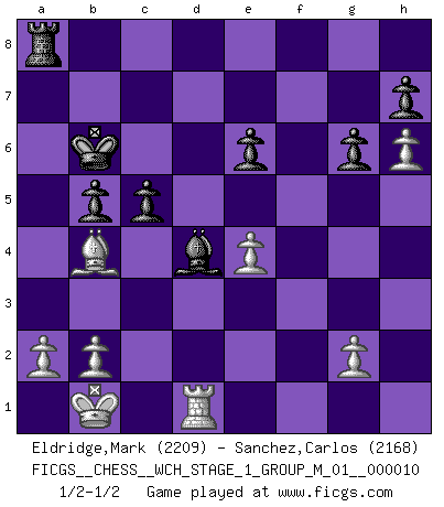 Last move : 1/2-1/2 2012 April 7 23:10:16 [Event "FICGS__CHESS__WCH_STAGE_1_GROUP_M_01__000010"] [Site "FICGS"] [Date "2012.01.01"] [Round "1"] [White "Eldridge,Mark"] [Black "Sanchez,Carlos"] [Result "1/2-1/2"] [WhiteElo "2209"] [BlackElo "2168"] 1.c4 g6 2.d4 Nf6 3.Nc3 Bg7 4.e4 d6 5.Nf3 O-O 6.Be2 e5 7.dxe5 dxe5 8.Qxd8 Rxd8 9.Bg5 Re8 10.O-O-O Na6 11.Ne1 Nc5 12.f3 Ne6 13.Be3 b6 14.Nd3 Bb7 15.Rd2 Nd7 16.Bd1 c6 17.Ba4 Ndf8 18.Kb1 Rac8 19.h4 Ba6 20.Nb4 Bb7 21.h5 Nd4 22.h6 Bf6 23.f4 Red8 24.Rhd1 Nfe6 25.fxe5 Bxe5 26.Nd3 Bf6 27.c5 Kf8 28.Bc2 Ba6 29.cxb6 Bxd3 30.Bxd3 axb6 31.Bf1 b5 32.Ne2 Nxe2 33.Bxe2 Rxd2 34.Rxd2 Ke7 35.Rc2 Bd4 36.Bd2 Kd7 37.Bg4 Ra8 38.Bxe6+ fxe6 39.Bb4 Kc7 40.Rc1 Kb6 41.Rd1 c5 1/2-1/2 English Opening Kingside Castling by player Black (move 5) Queenside Castling by player White (move 10) This chess game ended in a draw. Follow this game move after move (download)The only thing Chess players have in common is Chess. (Lodewijk Prins) Garry Kasparov war erst in der Großmeister-Organisation GMA, dann in der Profischach-Vereinigung PCA, zum Schluss kehrte er wieder in den Schoß der FIDE zurück. Aber gut, manche Leute sind flexibel (Viswanathan Anand) El Rey es una pieza de pelea. ¡Usenlo!. (Wilhelm Steinitz) Soyez une menace à chaque fois que vous vous asseyez pour jouer. (Ken Smith) Live, lose, and learn, by observing your opponent how to win. (Amber Steenbock)