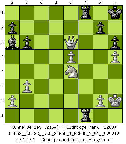 Last move : 1/2-1/2 2012 March 11 0:47:46 [Event "FICGS__CHESS__WCH_STAGE_1_GROUP_M_01__000010"] [Site "FICGS"] [Date "2012.01.01"] [Round "1"] [White "Kuhne,Detlev"] [Black "Eldridge,Mark"] [Result "1/2-1/2"] [WhiteElo "2164"] [BlackElo "2209"] 1.e4 e6 2.d4 d5 3.Nc3 Nf6 4.e5 Nfd7 5.f4 c5 6.Nf3 Nc6 7.Be3 Be7 8.Qd2 O-O 9.Be2 b6 10.O-O Bb7 11.Rad1 Rc8 12.f5 Nxd4 13.Nxd4 cxd4 14.Bxd4 exf5 15.Rxf5 Nc5 16.Bd3 Nxd3 17.Qxd3 Rc4 18.Rf4 h6 19.h3 Qd7 20.Qg3 Qe6 21.b3 Rc6 22.h4 Kh7 23.Rg4 Rg8 24.Rf1 Ba6 25.Rf2 Bc5 26.Bxc5 Rxc5 27.Ra4 d4 28.Rxd4 Rgc8 29.Ne4 Rxc2 30.Rd6 Rxf2 31.Rxe6 Rf1+ 32.Kh2 fxe6 33.h5 Rcf8 34.Qg6+ Kh8 35.Qxe6 1/2-1/2 French : Steinitz, Boleslavsky variation Kingside Castling by player Black (move 8) Kingside Castling by player White (move 10) This chess game ended in a draw. Follow this game move after move (download)A man that will take back a move at Chess will pick a pocket. (Richard Fenton) Schach ist eine Sache der genauen Beurteilung, wann man zuschlagen und wann man sich ducken muss. (Robert James Fischer) Fischer no está bajo la obligación de nadie. (Joseph Platz) Aux échecs, l'amour-propre est satisfait quand on remporte la victoire, mais il n'y a pas de honte à être battu. (Benjamin Franklin) Without enthusiasm, virtue functions not at all, and vice only poorly. (Mignon McLaughlin, The Neurotic's Notebook, 1960)