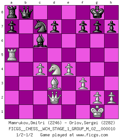 Last move : 1/2-1/2 2012 January 23 18:7:39 [Event "FICGS__CHESS__WCH_STAGE_1_GROUP_M_02__000010"] [Site "FICGS"] [Date "2012.01.01"] [Round "1"] [White "Mamrukov,Dmitri"] [Black "Orlov,Vladimir"] [Result "1/2-1/2"] [WhiteElo "2246"] [BlackElo "2282"] 1.d4 Nf6 2.c4 e6 3.Nf3 b6 4.a3 Ba6 5.Qc2 Bb7 6.Nc3 c5 7.e4 cxd4 8.Nxd4 Bc5 9.Nb3 Nc6 10.Nxc5 bxc5 11.Be3 Nd4 12.Qd1 e5 13.Bd3 Qe7 14.O-O O-O 15.b4 cxb4 16.axb4 Qxb4 17.Qd2 Bc6 18.Rfb1 Qd6 19.f3 Rfb8 20.Rxb8+ Qxb8 21.Bxd4 exd4 22.Ne2 Ne8 23.Ra5 Nc7 24.Nxd4 1/2-1/2 Queen's Indian : Petrosian system Kingside Castling by player White (move 14) Kingside Castling by player Black (move 14) This chess game ended in a draw. Follow this game move after move (download)I'm not a materialistic person, in that, I don't suffer the lack or loss of money. The absence of worldly goods I don't look back on. For Chess is a way I can be as materialistic as I want without having to sell my soul. (Jamie Walter Adams) Schach ist mein Leben, meine Leidenschaft, was ich gelernt habe und seit meinem 14. Lebensjahr profimässig praktiziere. Darauf zu verzichten, würde mir sehr schwer fallen. (Viktor Kortschnoi) Cuando le juegas a Fischer, no es una cuestion de si vas a ganar o perder. Es una cuestion de si vas a sobrevivir. (Boris Spassky) Les échecs c'est le défi de l'alpiniste, toujours plus haut, prêt à tout pour monter à l'assaut du Roi ennemi. Les échecs, c'est de la musique en mouvement, un ballet majestueux pour les yeux. C'est de la poésie composée par les fantômes du passé qui au même titre que Rimbaud ou Verlaine méritent notre admiration. Les échecs, c'est de la peinture ou le moindre mouvement modifie le tableau pour en faire un Picasso ou un Van Gogh. Les échecs, c'est tout et rien, c'est la vie et la mort. Jjulie33 sur le forum de France-Echecs. When you don't know what to do, walk fast and look worried. (Anonymous)