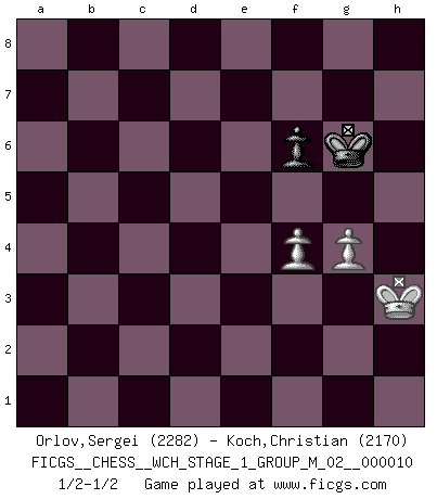 Last move : 1/2-1/2 2012 April 3 17:17:42 [Event "FICGS__CHESS__WCH_STAGE_1_GROUP_M_02__000010"] [Site "FICGS"] [Date "2012.01.01"] [Round "1"] [White "Orlov,Vladimir"] [Black "Koch,Christian"] [Result "1/2-1/2"] [WhiteElo "2282"] [BlackElo "2170"] 1.e4 e5 2.Nf3 Nc6 3.Bb5 Nf6 4.O-O Nxe4 5.d4 Nd6 6.Bxc6 dxc6 7.dxe5 Nf5 8.Qxd8+ Kxd8 9.Nc3 Ke8 10.h3 Be7 11.g4 Nh4 12.Nxh4 Bxh4 13.Rd1 h5 14.f3 hxg4 15.hxg4 f6 16.exf6 gxf6 17.Kg2 Kf7 18.Rh1 Be6 19.Bf4 Rag8 20.Bg3 Bxg3 21.Kxg3 Rd8 22.Rad1 Rxh1 23.Rxd8 Rg1+ 24.Kf4 Rg2 25.Rb8 b5 26.Rb7 Kg6 27.Rxa7 Rxc2 28.Rxc7 b4 29.Rxc6 bxc3 30.Rxe6 cxb2 31.Rb6 Rc4+ 32.Ke3 Rc3+ 33.Kf2 Rc2+ 34.Kg3 b1Q 35.Rxb1 Rxa2 36.Rb3 Ra1 37.f4 Rg1+ 38.Kh4 Rh1+ 39.Rh3 Ra1 40.Rd3 Rh1+ 41.Kg3 Rg1+ 42.Kh3 Rf1 43.Rd4 Rf3+ 44.Kg2 Re3 45.Rd1 Kf7 46.Rh1 Ra3 47.Rh3 Rxh3 48.Kxh3 Kg6 1/2-1/2 Ruy Lopez : Berlin defense, Open variation Kingside Castling by player White (move 4) 10 pieces endgame at move 30 : White KRPPPP , Black KRPP WHITE : King + 1 Rook 4 Pawns BLACK : King + 1 Rook 2 Pawns 9 pieces endgame at move 30 : White KRPPP , Black KRPP WHITE : King + 1 Rook 3 Pawns BLACK : King + 1 Rook 2 Pawns Promotion Queen by player Black (move 34) 8 pieces endgame at move 35 : White KRPPP , Black KRP WHITE : King + 1 Rook 3 Pawns BLACK : King + 1 Rook 1 Pawn 7 pieces endgame at move 35 : White KRPP , Black KRP WHITE : King + 1 Rook 2 Pawns BLACK : King + 1 Rook 1 Pawn 6 pieces endgame at move 47 : White KPP , Black KRP WHITE : King + 2 Pawns BLACK : King + 1 Rook 1 Pawn 5 pieces endgame at move 48 : White KPP , Black KP WHITE : King + 2 Pawns BLACK : King + 1 Pawn This chess game ended in a draw. Follow this game move after move (download)It is always better to sacrifice your opponent's men. (Savielly Tartakower) Ich habe die besten Aussichten, den ersten Preis zu gewinnen - denn jeder muss gegen Steinitz spielen, nur ich nicht! (Wilhelm Steinitz) En la perfecta combinación de Ajedrez como en una historia corta de primera clase, toda la trama y contra trama deberá conducir hacia un final sorprendente, el interes no es mitigado hasta el último momento. (Yates and Winter) On n'a jamais que l'âge auquel on a commence à jouer aux échecs car après on cesse de vieillir. (Capablanca) There is a great deal of difference between an eager man who wants to read a book and a tired man who wants a book to read. (G.K. Chesterton)