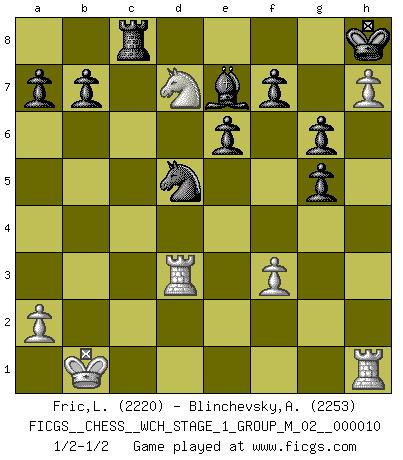 Last move : 1/2-1/2 2012 May 16 23:5:37 [Event "FICGS__CHESS__WCH_STAGE_1_GROUP_M_02__000010"] [Site "FICGS"] [Date "2012.01.01"] [Round "1"] [White "Fric,Lubos"] [Black "Blinchevsky,Alexander"] [Result "1/2-1/2"] [WhiteElo "2220"] [BlackElo "2253"] 1.e4 c6 2.d4 d5 3.Nc3 dxe4 4.Nxe4 Bf5 5.Ng3 Bg6 6.h4 h6 7.Nf3 Nd7 8.h5 Bh7 9.Bd3 Bxd3 10.Qxd3 e6 11.Bf4 Qa5+ 12.Bd2 Bb4 13.c3 Be7 14.c4 Qc7 15.O-O-O Ngf6 16.Kb1 O-O 17.Ne4 Rad8 18.Nxf6+ Nxf6 19.Qe2 c5 20.g4 cxd4 21.g5 hxg5 22.h6 d3 23.Qe1 g6 24.h7+ Kh8 25.Ba5 Qxc4 26.Bxd8 Bxd8 27.Ne5 Qb5 28.Qc3 Ba5 29.b4 Qxb4+ 30.Qxb4 Bxb4 31.Rxd3 Be7 32.f3 Nd5 33.Nd7 Rc8 1/2-1/2 Caro-Kann : Classical, 7...Nd7 Queenside Castling by player White (move 15) Kingside Castling by player Black (move 16) This chess game ended in a draw. Follow this game move after move (download)Fischer is the strongest player in the world. In fact, the strongest player who ever lived. (Larry Evans) Wenn Du einsam bist, wenn Du Dich in der Welt wie ein Fremder fühlst, spiele Schach. Das wird Deinen Geist erheben und Dein Ratgeber im Kampf sein. (Aristoteles) Todo lo que importa ante el tablero de Ajedrez son buenas jugadas. (Bobby Fischer) La vérité est comme le meilleur coup aux échecs : elle existe, mais il faut la chercher. (Arturo Perez-Reverte) The weakness of an artist is dogma. (Josh Waitzkin)