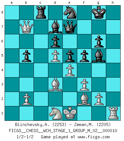 Last move : 1/2-1/2 2012 May 31 18:21:51 [Event "FICGS__CHESS__WCH_STAGE_1_GROUP_M_02__000010"] [Site "FICGS"] [Date "2012.01.01"] [Round "1"] [White "Blinchevsky,Alexander"] [Black "Zeman,Martin"] [Result "1/2-1/2"] [WhiteElo "2253"] [BlackElo "2205"] 1.d4 Nf6 2.c4 g6 3.Nc3 Bg7 4.e4 d6 5.f3 O-O 6.Be3 Nc6 7.Nge2 a6 8.Qd2 Rb8 9.Nc1 e5 10.d5 Nd4 11.Nb3 Nxb3 12.axb3 c5 13.b4 cxb4 14.Na4 b5 15.cxb5 axb5 16.Qxb4 Ne8 17.Nc3 Bh6 18.Bf2 Qg5 19.Rd1 Bd7 20.h4 Qe7 21.h5 Bg5 22.hxg6 hxg6 23.Ra1 Nc7 24.Ra7 Rfc8 25.Nd1 Ra8 26.Qa5 Rxa7 27.Qxa7 f5 28.Bd3 Ne8 29.Qb7 1/2-1/2 King's Indian : Saemisch, Panno formation Kingside Castling by player Black (move 5) This chess game ended in a draw. Follow this game move after move (download)It is not a move, even the best move that you must seek, but a realizable plan. (Eugene Znosko-Borovsky) Vom Schach wurde gesagt das Leben sei dafür nicht lange genug. Aber das ist der Fehler des Lebens, nicht des Schach'. (Irving Chernev) Durante una competencia de Ajedrez, un Maestro de Ajedrez deberá ser una combinación de presa de caza y un Monge. (Alexander Alekhine) J'ai vu le vaincu d'Echecs jouer des années durant dans l'espoir de la fête de la victoire. Car tu es plus riche de ce qu'elle existe si même elle n'est point pour toi. Ainsi de la perle du fond des mers. (Antoine de Saint-Exupéry) Man is still the most extraordinary computer of all. (John F. Kennedy)