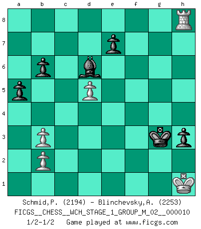 Last move : 1/2-1/2 2012 November 9 23:20:20 [Event "FICGS__CHESS__WCH_STAGE_1_GROUP_M_02__000010"] [Site "FICGS"] [Date "2012.01.01"] [Round "1"] [White "Schmid,Pablo"] [Black "Blinchevsky,Alexander"] [Result "1/2-1/2"] [WhiteElo "2194"] [BlackElo "2253"] 1.d4 d5 2.Bf4 Nf6 3.e3 c5 4.c3 Nc6 5.Nd2 Qb6 6.Qb3 c4 7.Qc2 g6 8.e4 Nxe4 9.Nxe4 dxe4 10.Bxc4 Bg7 11.Ne2 f5 12.O-O Na5 13.Bb3 Bd7 14.Be3 Nxb3 15.axb3 O-O 16.c4 a5 17.Rfd1 Rfc8 18.Nc3 Be8 19.c5 Qc7 20.d5 Bf7 21.Nb5 Qe5 22.Nc3 Qc7 23.g3 h6 24.Na4 g5 25.c6 Rab8 26.Bb6 Qd6 27.Rac1 Bh5 28.Ba7 Bxd1 29.Rxd1 Kh7 30.Nb6 Qd8 31.g4 Qc7 32.Rc1 Qf4 33.Bxb8 Rxb8 34.c7 Be5 35.Kf1 Qxh2 36.cxb8Q Bxb8 37.Ke2 Qg2 38.Rf1 Qf3+ 39.Kd2 Bf4+ 40.Ke1 Bd6 41.Na4 Qxg4 42.Qe2 Qf4 43.Kd1 g4 44.Qe3 Qe5 45.Nc3 Kg6 46.Rh1 h5 47.Ke1 Qf6 48.Rg1 Bh2 49.Rh1 Bd6 50.Nxe4 fxe4 51.Qxe4+ Kg5 52.Qh7 Qg6 53.Qxg6+ Kxg6 54.f3 Kg5 55.Kf2 h4 56.fxg4 Kxg4 57.Rf1 Bc5+ 58.Kg2 h3+ 59.Kh1 Kg3 60.Rf8 Bd6 61.Rf7 Kg4 62.Rh7 Kg3 63.Rh8 b6 1/2-1/2 Queen's pawn, Mason variation Kingside Castling by player White (move 12) Kingside Castling by player Black (move 15) Promotion Queen by player White (move 36) This chess game ended in a draw. Follow this game move after move (download)Man is a frivolous, a specious creature, and like a Chess player, cares more for the process of attaining his goal than for the goal itself. (Dostoyevsky) Es ist wirklich schade, dass so viele Schachspieler nicht auf ihr Äußeres achten! (Alexandra Kosteniuk) Coloca el contenido del tablero de Ajedrez en un sombrero, agita las piezas vigorosamente, derrámalas en el tablero desde una altura de medio metro y así obtienes el estilo de Wilhelm Steinitz. (H. E. Bird) Il vaut mieux sacrifier les pièces de l'adversaire. (Xavier Tartacover) May I never be complete. May I never be content. May I never be perfect. Deliver me, Tyler, from being perfect and complete. (Chuck Palahniuk, Fight Club)