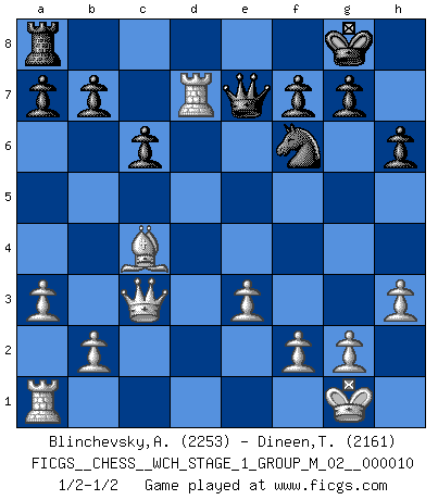 Last move : 1/2-1/2 2012 March 22 22:10:41 [Event "FICGS__CHESS__WCH_STAGE_1_GROUP_M_02__000010"] [Site "FICGS"] [Date "2012.01.01"] [Round "1"] [White "Blinchevsky,Alexander"] [Black "Dineen,Thomas"] [Result "1/2-1/2"] [WhiteElo "2253"] [BlackElo "2161"] 1.d4 d5 2.c4 c6 3.Nf3 Nf6 4.Nc3 e6 5.Bg5 h6 6.Bxf6 Qxf6 7.e3 Nd7 8.Bd3 dxc4 9.Bxc4 Bd6 10.O-O Qe7 11.Qc2 O-O 12.Ne4 Bc7 13.Bd3 Rd8 14.Rfd1 Nb6 15.h3 e5 16.Nxe5 Bxe5 17.dxe5 Qxe5 18.Nd2 Nd5 19.Nf3 Qe7 20.a3 Nf6 21.Qc3 Be6 22.Nd4 Rd7 23.Nxe6 Qxe6 24.Bc4 Qe7 25.Rxd7 1/2-1/2 QGD Slav : 4.Nc3 Kingside Castling by player White (move 10) Kingside Castling by player Black (move 11) This chess game ended in a draw. Follow this game move after move (download)For me, Chess is life and every game is like a new life. Every Chess player gets to live many lives in one lifetime. (Eduard Gufeld) Das Schachspiel ist ein See, in welchem eine Mücke baden und ein Elefant ertrinken kann. (Emanuel Lasker) No hay otro maestro que tenga una voluntad terrífica de ganar. Al tablero, el irradía peligro y aún los oponentes mas fuertes tienden a congelarse como liebres cuando olfatean a una pantera. Aún sus debilidades son peligrosas. Con las blancas, su juego de apertura es predecible - te es posible hacer planes en su contra - pero es tan fuerte que tus planes casi nunca funcionan. En el juego medio, su precisión e invención son fabulosas y en finales, tú simplemente no le puedes vencer. (Experto Alemán anónimo) Le plus grand jeu de l'esprit jamais inventé, plus vous l'apprenez, plus vous y prenez du plaisir. (Garry Kasparov) How many people work in NATO Headquarters ? - About half of them. (Dirk Stikker, NATO general secretary)