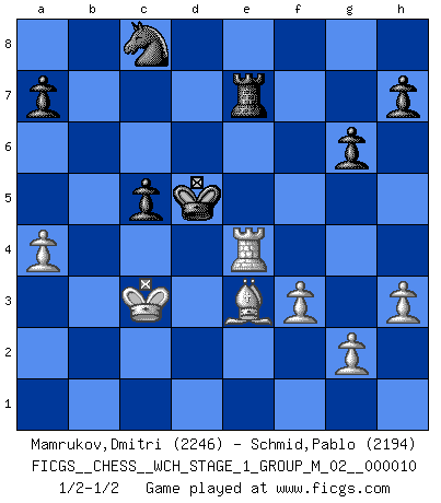 Last move : 1/2-1/2 2012 April 9 1:42:56 [Event "FICGS__CHESS__WCH_STAGE_1_GROUP_M_02__000010"] [Site "FICGS"] [Date "2012.01.01"] [Round "1"] [White "Mamrukov,Dmitri"] [Black "Schmid,Pablo"] [Result "1/2-1/2"] [WhiteElo "2246"] [BlackElo "2194"] 1.d4 Nf6 2.c4 g6 3.Nc3 d5 4.Nf3 Bg7 5.Bg5 Ne4 6.Bh4 Nxc3 7.bxc3 dxc4 8.Qa4+ Qd7 9.Qxc4 b6 10.e3 Ba6 11.Qb3 Bxf1 12.Kxf1 O-O 13.Ke2 Nc6 14.Rhd1 Na5 15.Qb4 Rfe8 16.Rac1 e5 17.dxe5 Qe6 18.Qa4 Bxe5 19.Nxe5 Qxe5 20.Bg3 Qc5 21.Kf1 Rad8 22.Kg1 c6 23.Rd4 Rxd4 24.Qxd4 Qxd4 25.cxd4 f5 26.Kf1 Kf7 27.Ke2 Ke6 28.f3 Kd5 29.Kd3 Nb7 30.Re1 Nd6 31.Bf4 Re7 32.Bg5 Re6 33.a4 c5 34.dxc5 bxc5 35.Bf4 Nc8 36.e4+ fxe4+ 37.Rxe4 Re7 38.h3 Kc6 39.Kc3 Kd5 40.Be3 1/2-1/2 King's Indian defense, 3.Nc3 Kingside Castling by player Black (move 12) This chess game ended in a draw. Follow this game move after move (download)I am the best player in the world and I am here to prove it. (Bobby Fischer) Schach ist ein Kampf gegen den Fehler. (Johannes Herrman Zukertort) Botvinnik trató de alejar el misterio referente al Ajedrez, siempre relacionandolo a situaciones de la vida diaria. Solía llamar al Ajedrez un problema inexacto típico, similar a aquellos en que la gente tiene siempre que resolver a cada día. (Garry Kasparov) Une platitude souvent récitée à propos des Echecs est qu'une des choses les plus difficiles à réaliser est de gagner une position gagnante. Cela ne manque pas de sens mais, pour ma part, j'ai toujours trouvé plus difficile de gagner une position perdante. (Tim Krabbe) For a mechanic, you seem to do an excessive amount of thinking. (C-3PO in Star Wars ep.2)